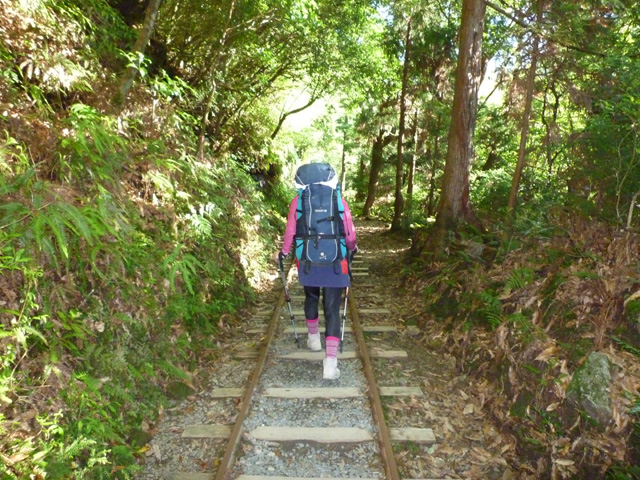 荒川口はきれいなトイレ、駐車場がある登山口。早朝から縄文杉を目指すツアー客で賑わっています。安房森林鉄道の軌道上(トロッコ道)を歩きます。この鉄道は使用されており、作業員たちを乗せて運転していますので近づいたら速やかに道を空けましょう。小杉谷集落跡には小中学校跡もあり、解説付きの看板があり昔の栄華が偲ばれます。校庭跡に入れますがところどころ陥没しており進入禁止になっています。