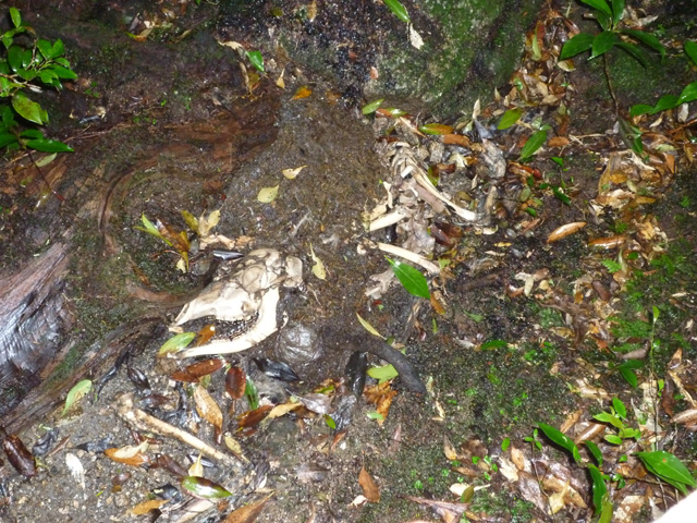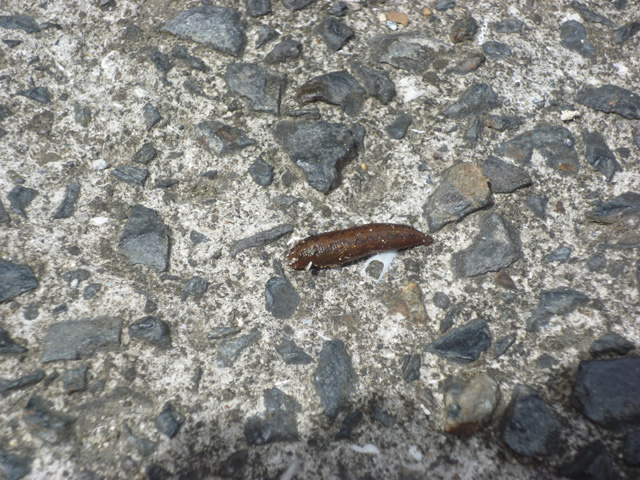 三日目、レインウェアを着たとき、樹林帯のなかだし暑いし…と油断し、パンツを着ませんでした。すると…。鯛之川出合の辺りで休憩したとき、同行者の腕にヒルが!!剥がそうとしましたが剥がれません。とっさに持参していた虫除け『バズオフ・アウトドアスプレー』をヒルに吹き付けると瞬く間に小さくなり、断末魔の叫びを残して(想像)ポロリと足元に落ちました。しかし今度は僕の両足のふくらはぎにヒルが…(>o<)!!再びシュッシュと吹き付け隔離成功。しかし尾之間温泉に着いたときにはさらに僕たちの身体には数匹のヒルが吸い付いていることに気づきました。ヒルたちはもう血を吸い満腹でパンパンに膨れ、剥がすこともせずにぽとりと落ちました。満足そうにくねくねと身体を動かすヒルの恨めしいこと!!奇しくもお互いわき腹をヒルに吸われ、温泉から上がった後もしばらく出血は続きました。僕たちの血をたらふく吸ったヒルは「ヤマビル」と呼ばれる種です。ヤマビルは吸い付いて吸血する際、唾液腺から「ヒルジン」というポリペプチドを分泌します。これは血を凝固しにくくするのでなかなか出血が止まらないのです!対策としては1.皮膚をなるべく露出しない。2.『ヒル下がりのジョニー』などの忌避剤を袖口や靴下に吹き付けておく。などです。『ヒル下がりのジョニー』は吸い付いたヒルを剥がすのにも効果的だそうです。僕は荷物を軽くするためこれをあえて持ってきませんでした。うーん、失敗した(T_T)/