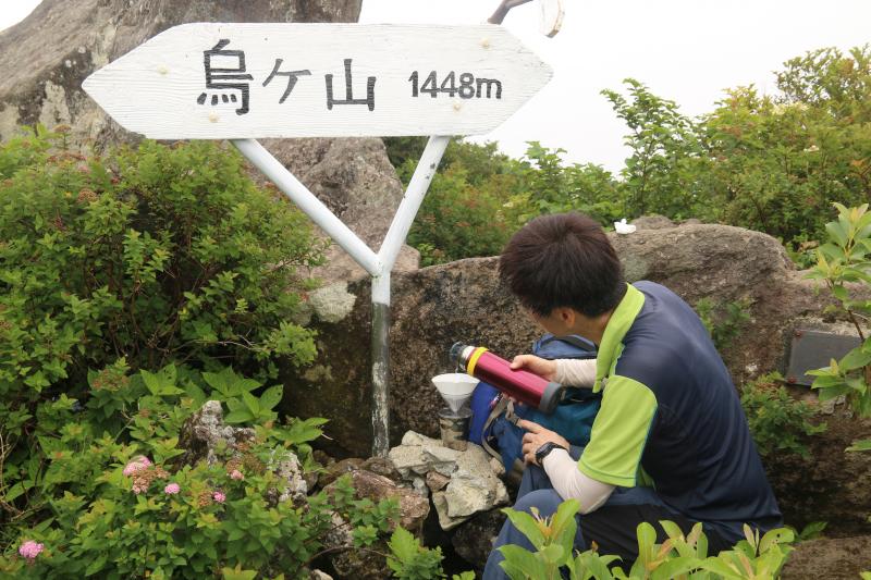 こちらで、珈琲のプロに近い友人による飛び切りおいしいドリップコーヒーを頂きました。(わたくしがおやつを忘れてしまい、おやつなし)とってもおいしい珈琲でまったり休憩です。鳥取の高校山岳部の若者が団体で来て、そちらの先生に写真を撮っていただきました。ありがとうございます。