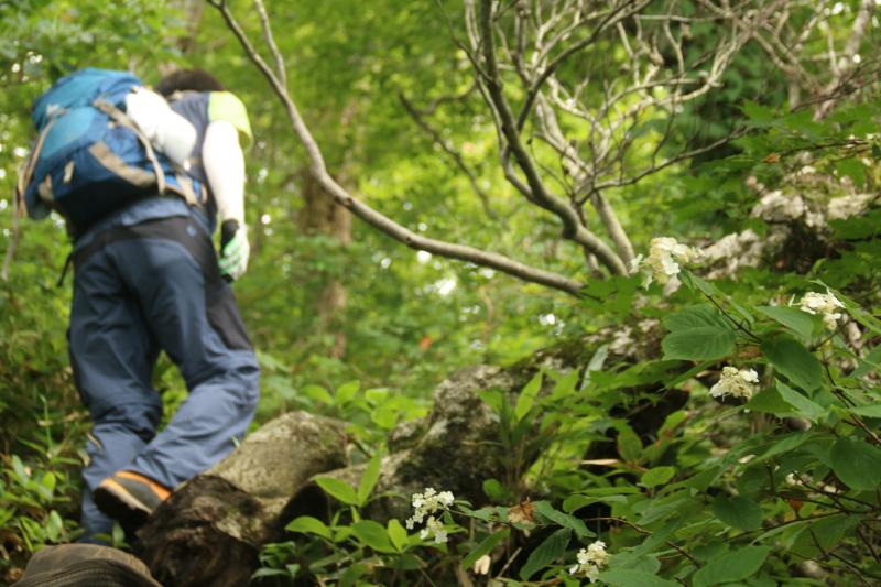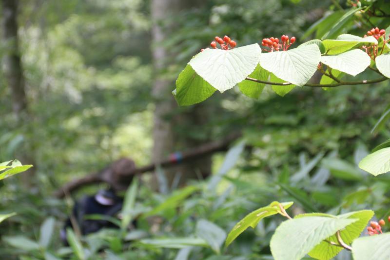 分岐から急登りに入り、育った笹をかき分けながら登っていきます。ヤマアジサイもまだ残っていて、ムシカリがもう実になっています。