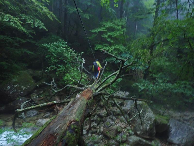 とりつきまでの道がすぐだよって言われてたので、ロープバックは斜めがけにして歩き出したが丸太の橋を渡るなんてきいてな~い。濡れた丸太を恐る恐るわたる。