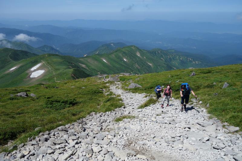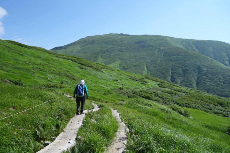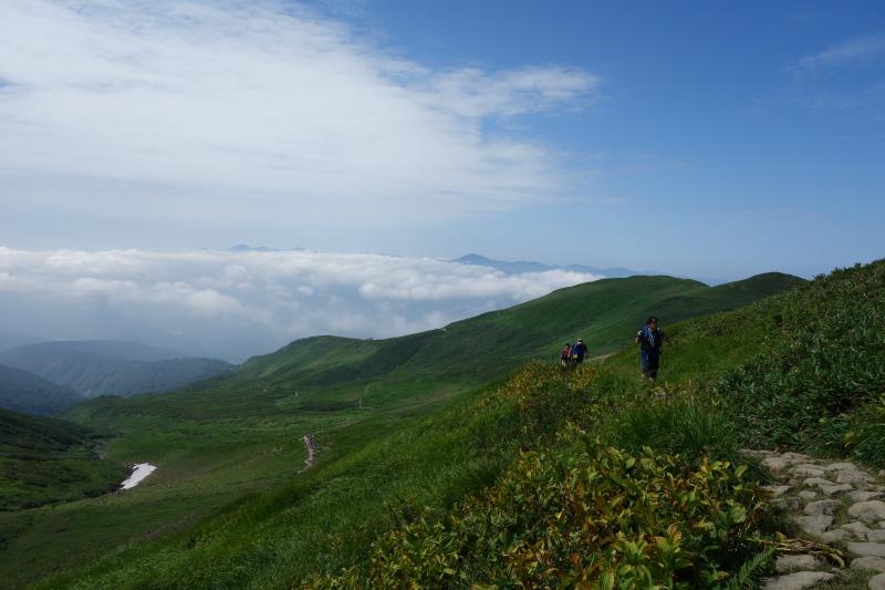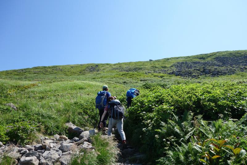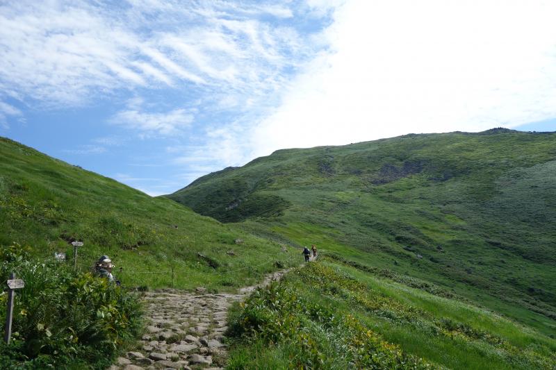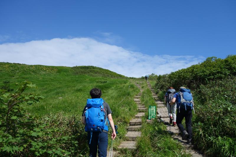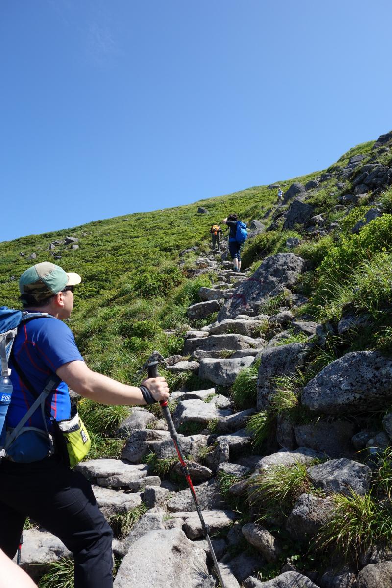 - ○リフト上駅から山頂までの間に日陰はほとんどありません。気温が高く日差しが強い日は特に熱中症に注意しましょう。今回はとても暑かったので、水は多めに持参して正解でした。日焼け止めも必須です。牛首から先しばらく進むと、急な上り坂が続きます。月山はなだらかな山の印象でしたが、ここの区間だけは意外と傾斜が急でした。