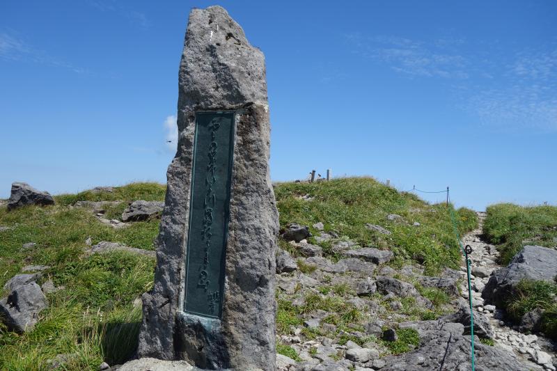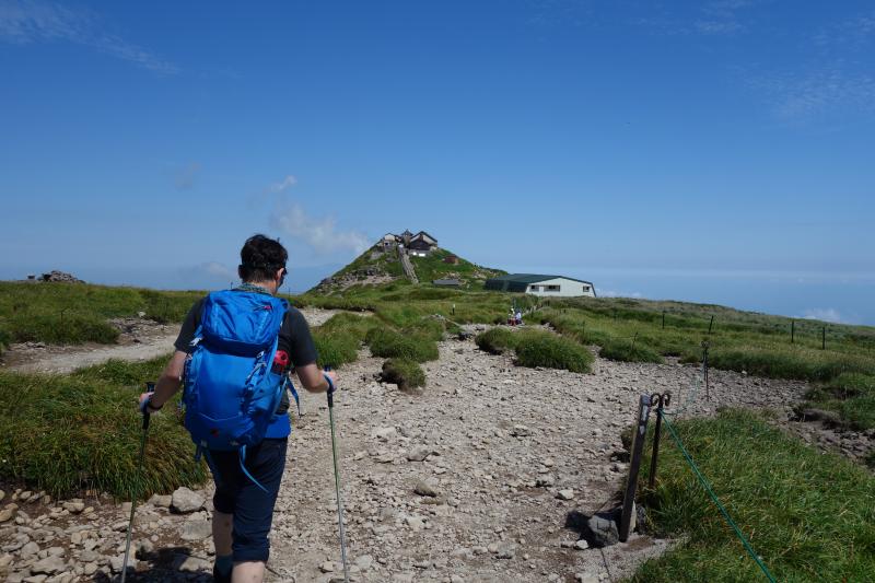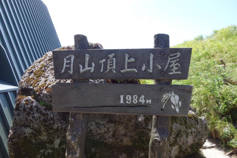 牛首にて姥ヶ岳からの道と合流。ここから山頂までコースタイム1時間。熱い日差しを浴びながら歩きます。すると、山頂の前に立ちはだかる壁のような急斜面が待っていました。コースの中で一番の頑張りどころです。上りきると平な場所に出て、その先に山頂の月山神社の建物が見えてきます。