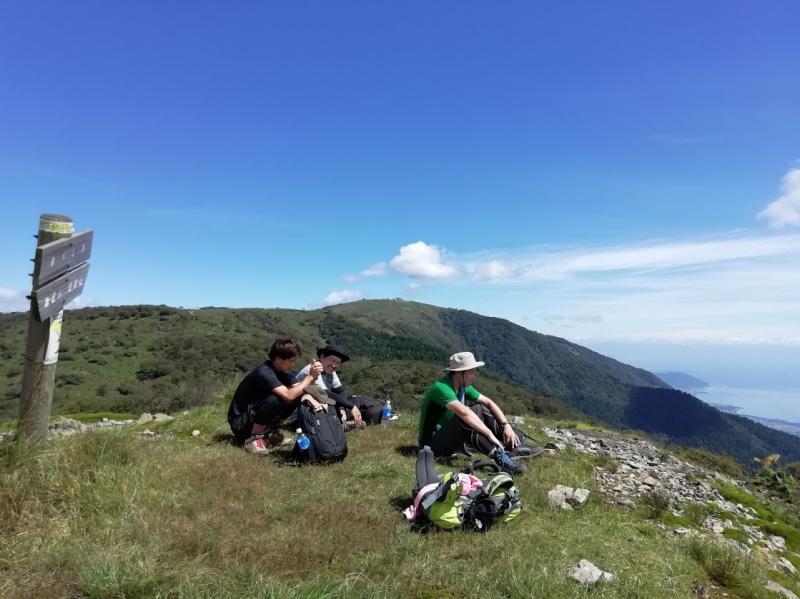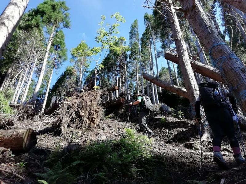 下山のサカ谷道はまたまた樹林帯で、風の抜けはなく、またまた汗だくでした。まあまあ長いので疲れます。みんなブツクサ言いながら降りていました。