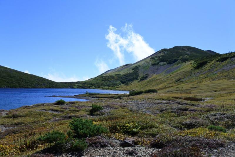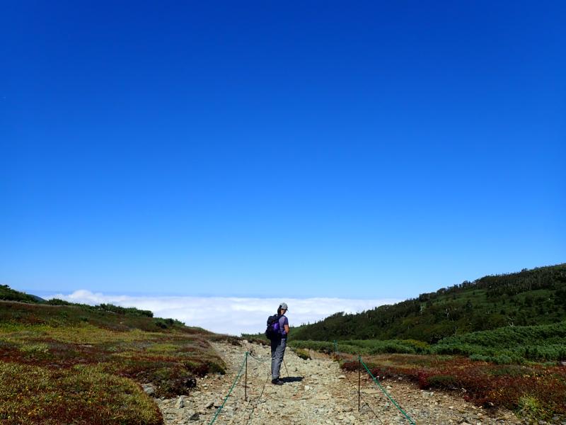上に行けば行くほど晴れてきて、白馬大池に到着したときは真っ青な青空しか見えなかった!!