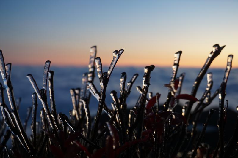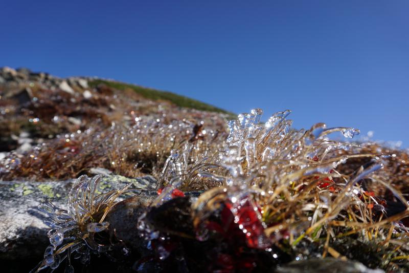既に枯れたチングルマやアザミの草々が氷で覆われてキラキラと光っている様は今の時期だけの特別な景色でした。