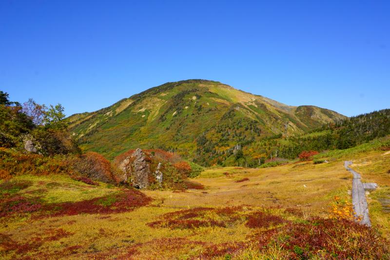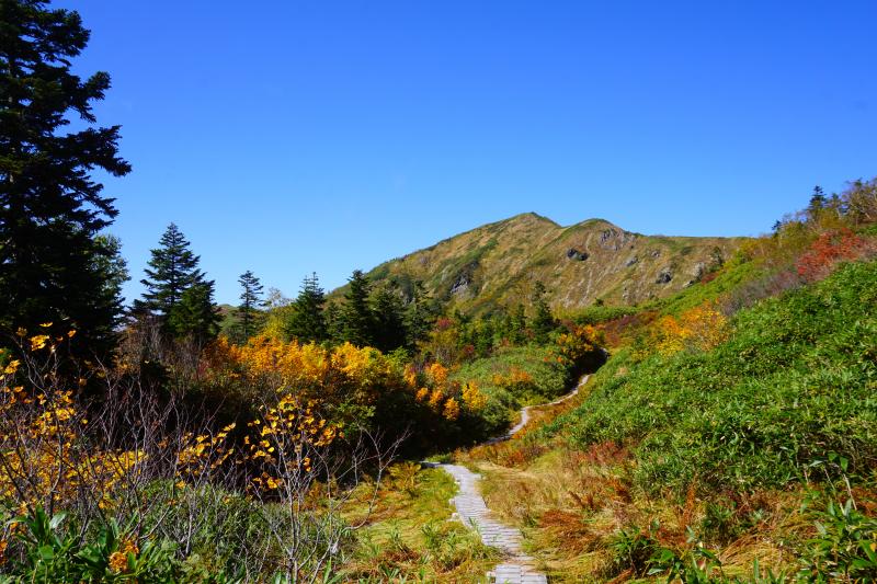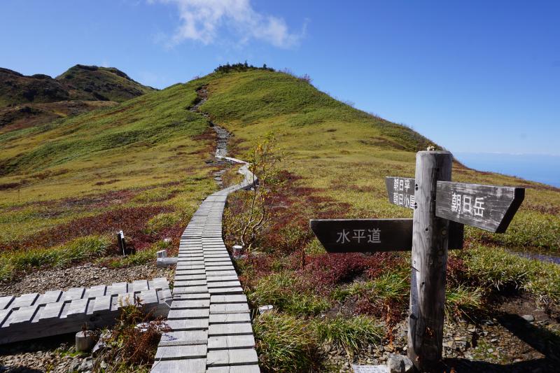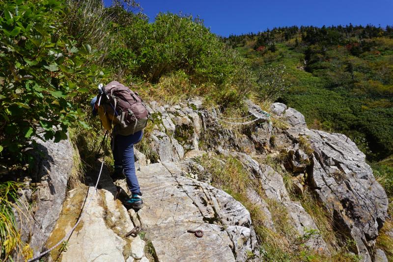 明日登る予定の朝日岳は避け、紅葉の盛りを迎えた水平道を快晴の中進みました。