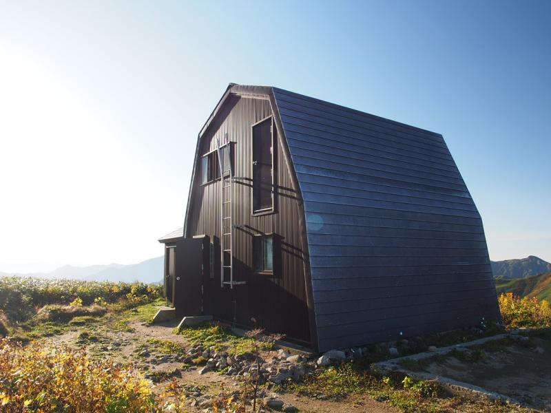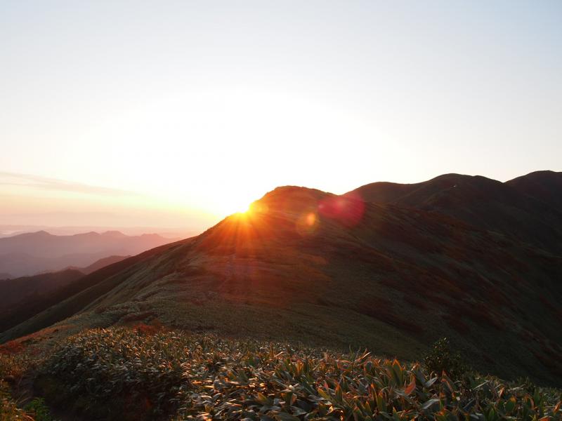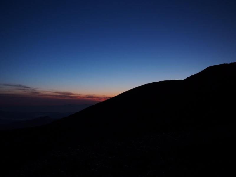 5時頃、頼母木小屋を出発。やっぱりこの日も朝はそこそこ風があったのでレインジャケットとグローブをして歩き出します。少し歩いていると昨日歩いた地神山付近からご来光が!太陽が出てすぐ暑くなってしまったのでレインジャケットを脱ぎました。大石山を朳差岳方面へ。一旦下って登り返しはありますがこの辺は歩きやすく、朳差岳への稜線がたまらない♪しばらくして朳差小屋に到着。