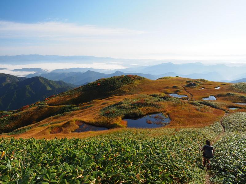 朳差岳からの景色も最高で、これまで歩いてきた飯豊山からの稜線も見渡せました♪そして朝日連峰も。来年の縦走は朝日連峰か?朳差岳を少し過ぎると急に高層湿原が現われる長者平に。新潟、福島、山形の県境であるので当然と言えば当然かもしれませんが雰囲気は谷川や平標、巻機山など湿原や笹原があり、あの辺りと似ているところがあります。