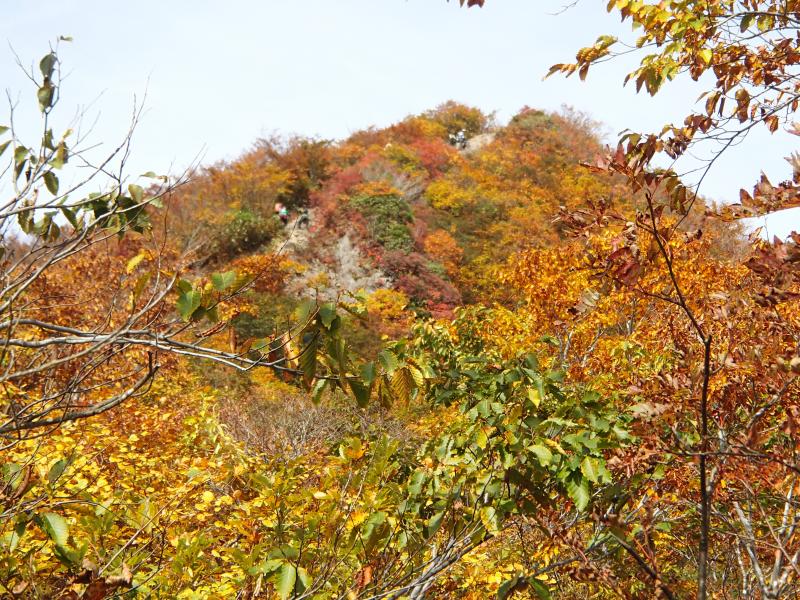 ・徐々に登りがキツくなっていき、樹林帯を抜けます。すると一気に素晴らしい展望が広がります!一ノ倉岳の独特の山容が目を惹きます。青空、紅葉、涼風、展望。すべてが素晴らしい!!