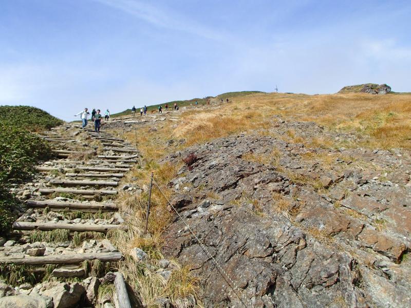 ・さすがに紅葉で有名、かつ人気の山だけあって平日でも登山者がたくさんいらっしゃいました。肩の小屋周辺は昼食を摂ったり休憩する方々で混雑していました。そのため、休憩は山頂付近でとることにして先を急ぎます。