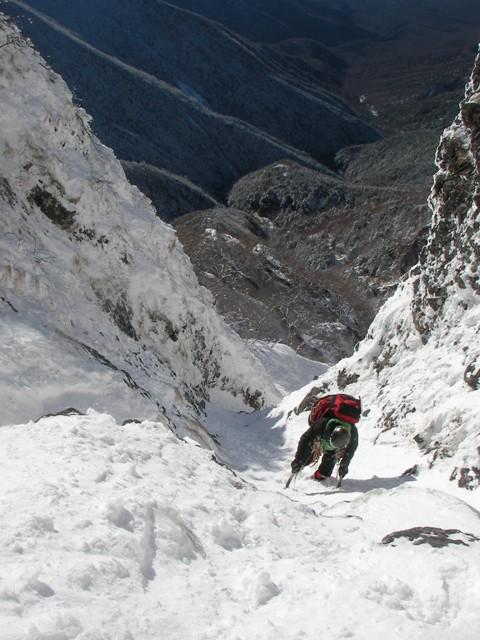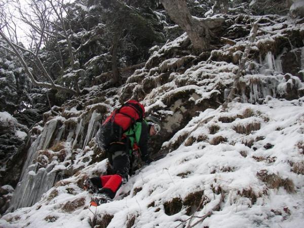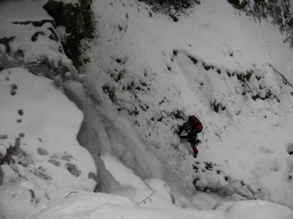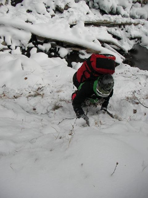 滝がなく、ラッセルになるところは岩壁の草付きを登ったのですが、