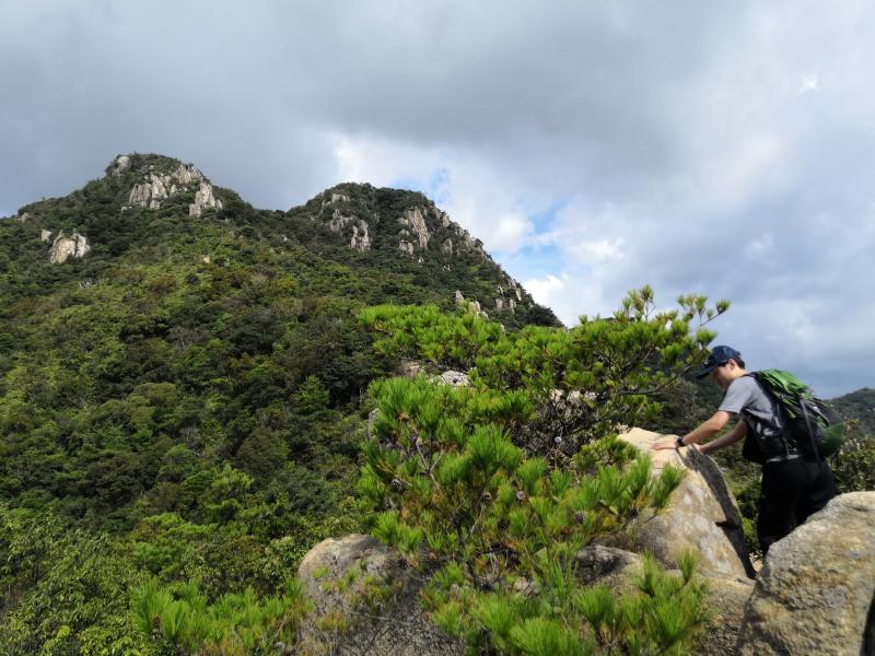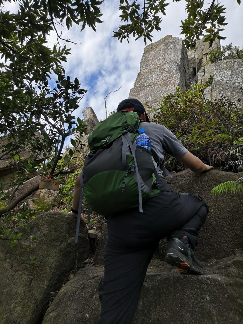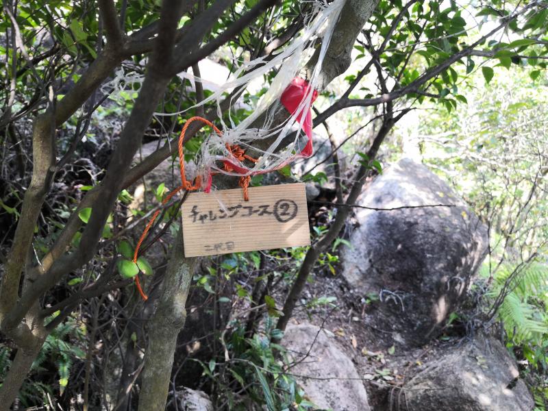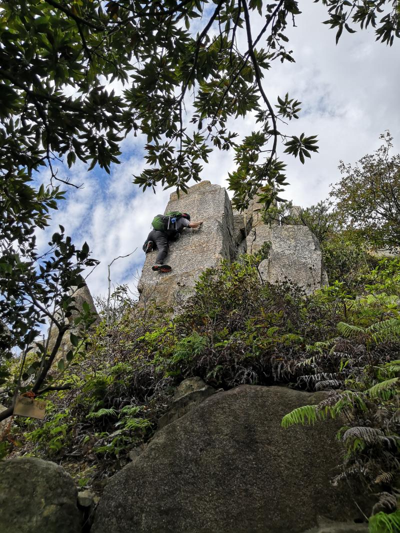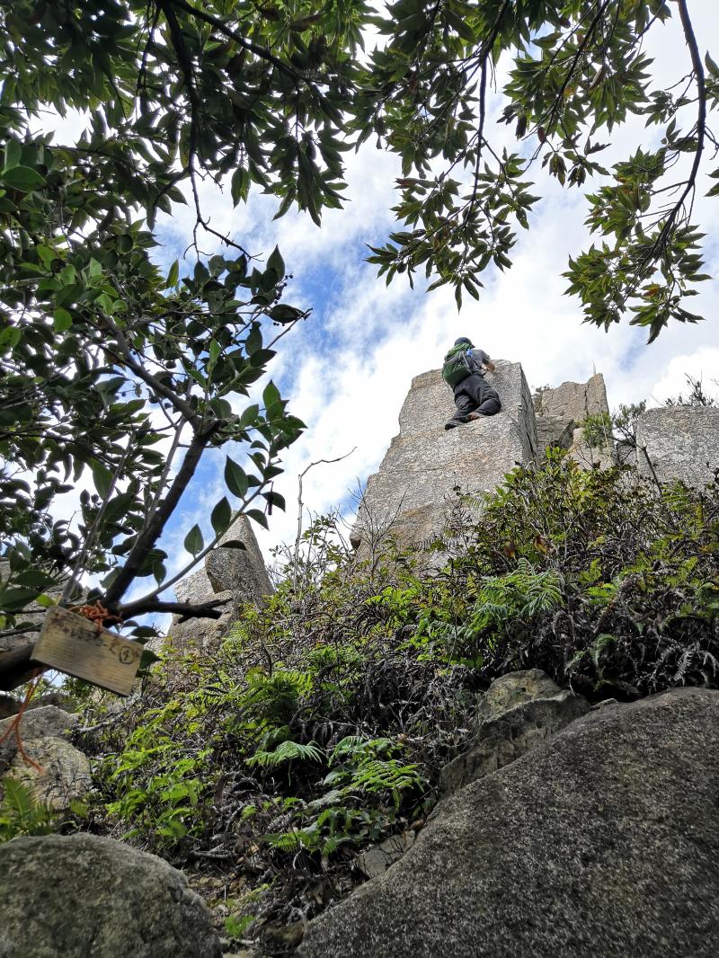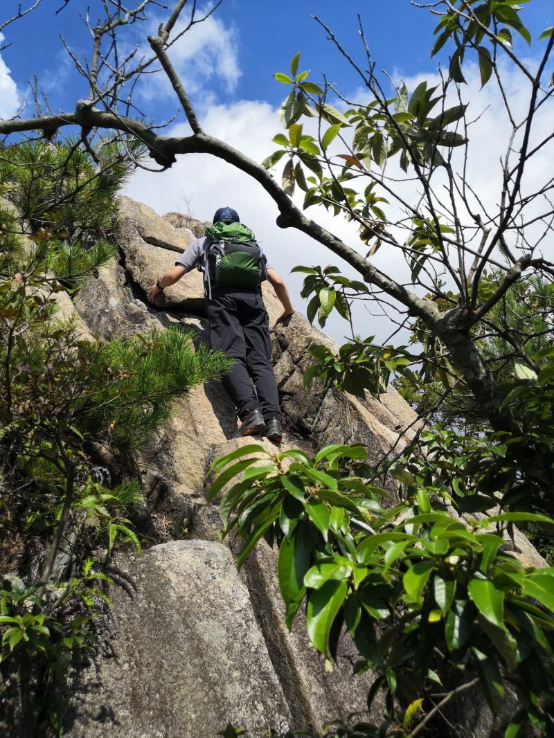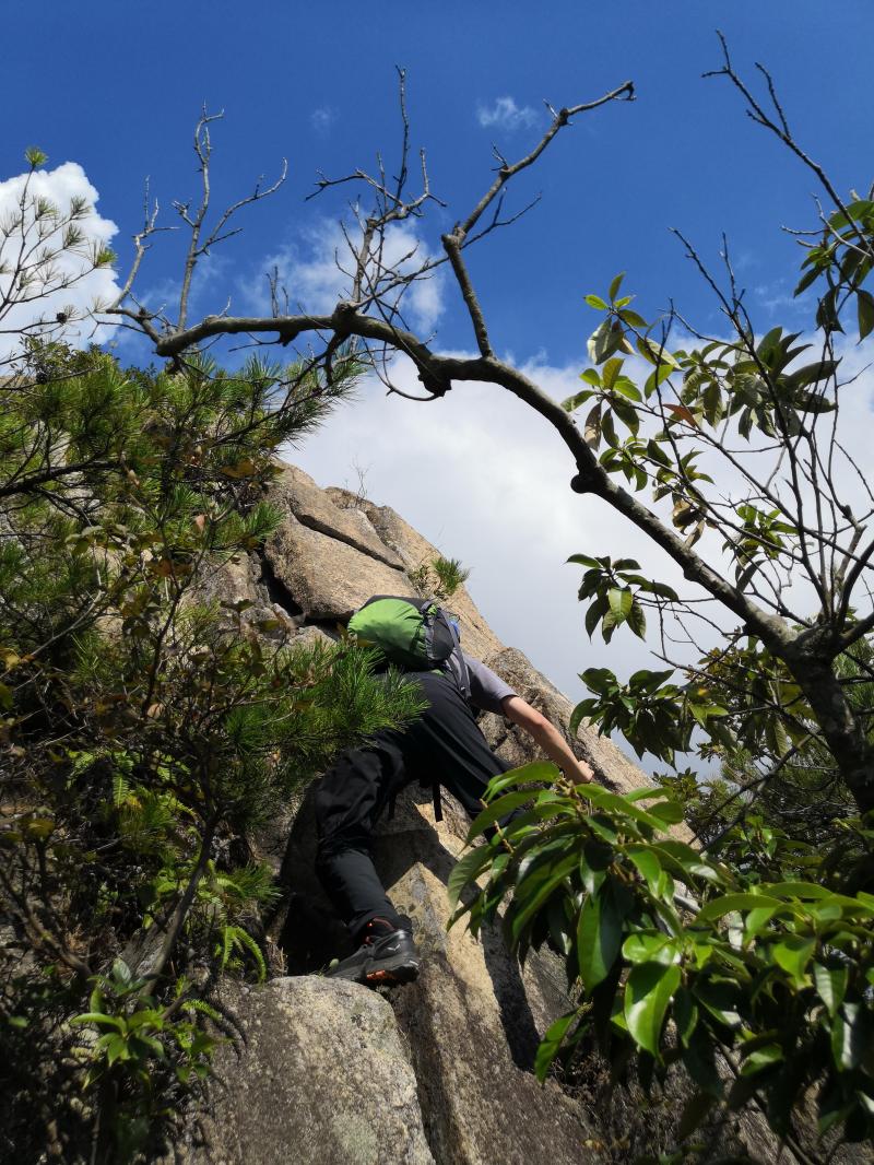 チャレンジコースは巻いてピークを踏むところもありますが、5.11台を登れる人なら見栄えのする一番かっこいいルート(チャレンジコースの分岐を入って顕著な直登ルート)もクライミングシューズがあれば登れると思いました。