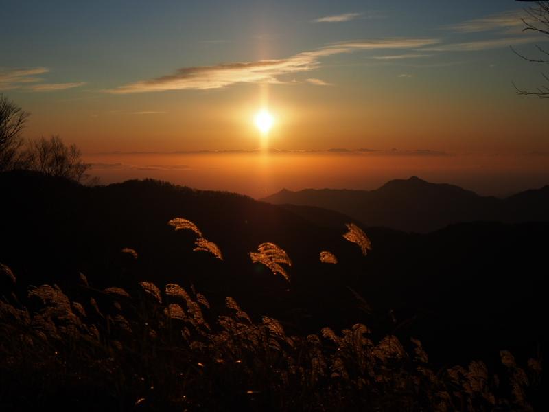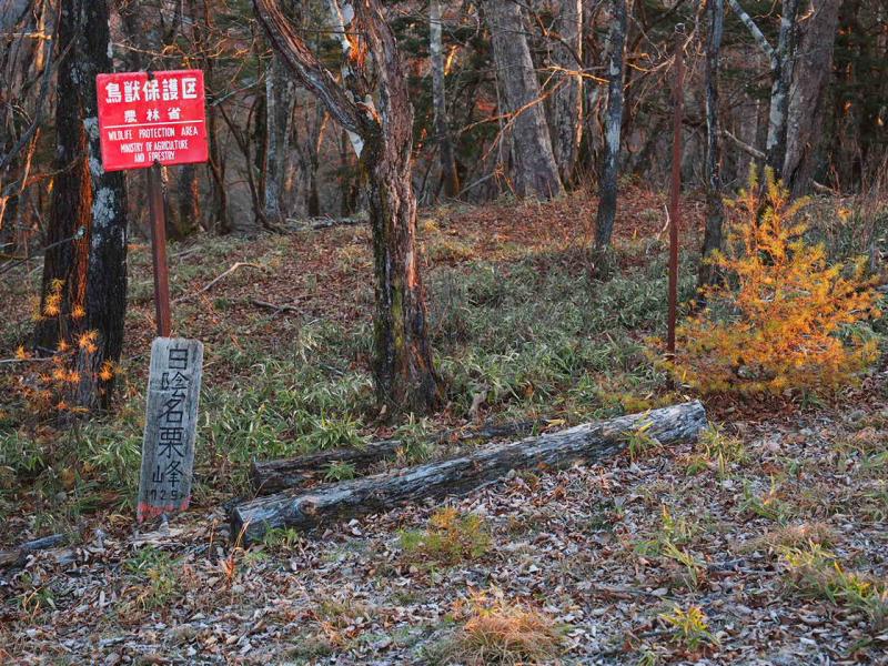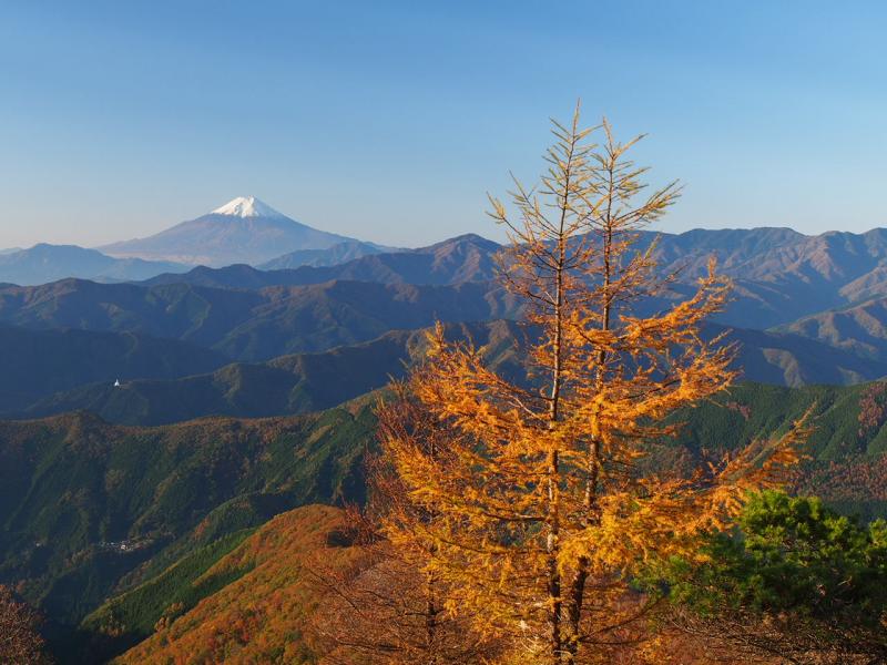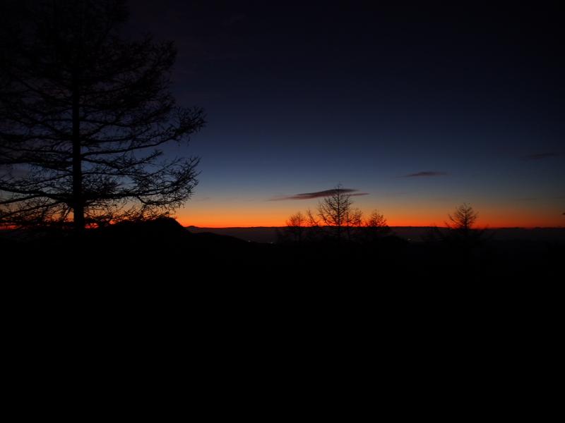 3日目は石尾根を歩いて奥多摩駅まで。いよいよクライマックス。この日も3:30起床5時出発。まだ星空が。この日もツェルトは全然結露せず。毎回こうだといいんですけどね(笑)他の皆さんは雲取山へ向かうようです。真っ暗な中、石尾根に上がります。石尾根に出たら結構風が強くて寒かったです。薄手ソフトシェルのフードをかぶって歩きます。日陰名栗山手前でだんだんと東の空がオレンジ色に。富士山も照らされて明るくなってきました。さらにはカラマツの紅葉も照らされて最高の風景です、この時間がたまらない♪日陰名栗山からはなかなか急な下り。