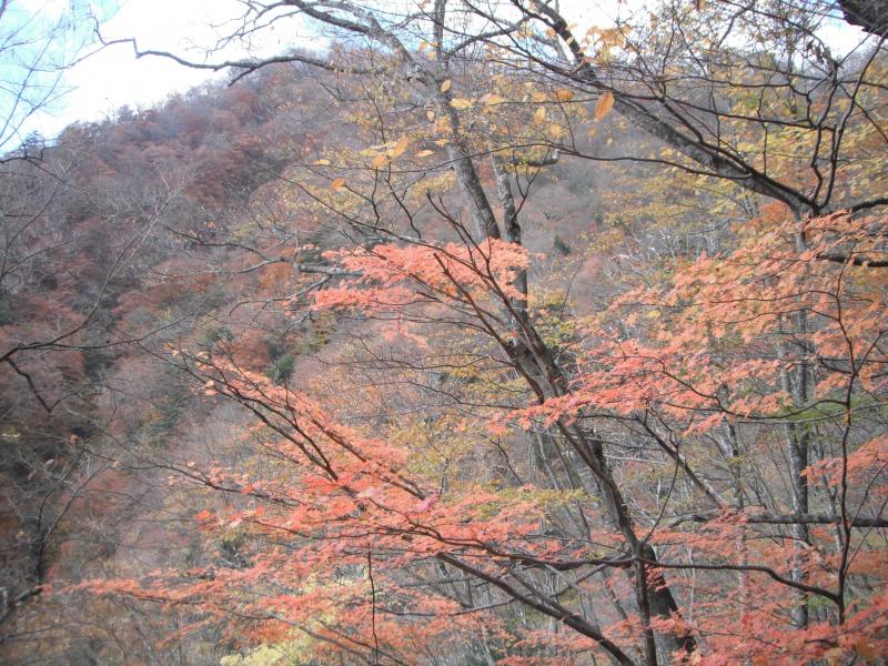 まずは奥多摩駅からバスで登山口の鴨沢へ。紅葉シーズンのせいか、結構混んでいました。鴨沢バス停でトイレを済ませ、スタート。集落の中を緩く登っていきます。駐車場を過ぎ、本格的な登山道へ。尾根の東側をのんびり歩いていきますが、紅葉が綺麗で写真を撮りながら行くのでなかなか進みません。見覚えのある廃屋や畑?などを過ぎると堂所に到着。ここからひと上りで七ツ石山、巻き道は崩落のため通行止めとなっているので山頂を経由していきます。初めての時はザックの重さに文字通り押しつぶされそうになりながら巻き道を行きました。七ツ石山からはこれから歩く雲取山方面が見渡せます。稜線の紅葉はもう終わりのようです。