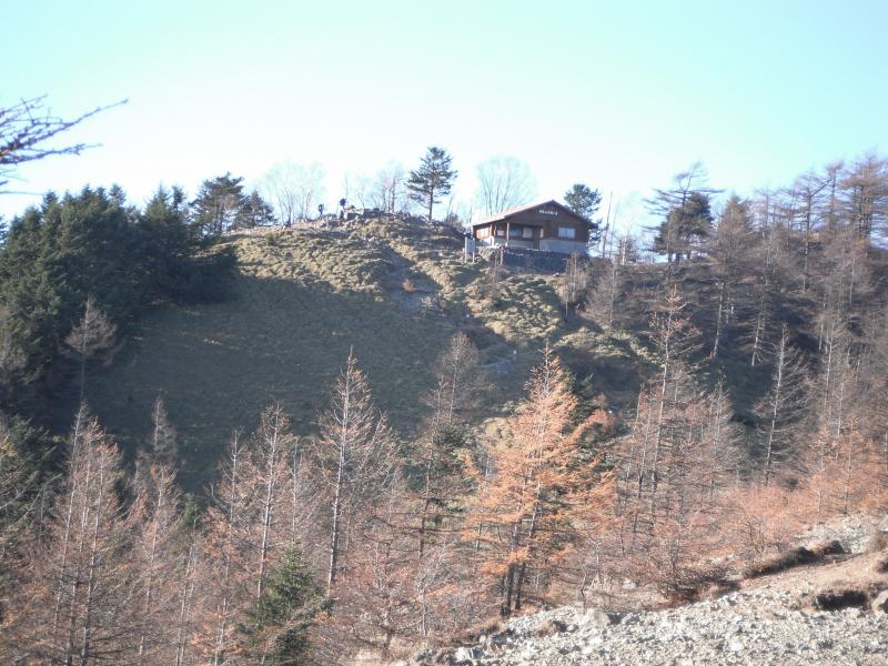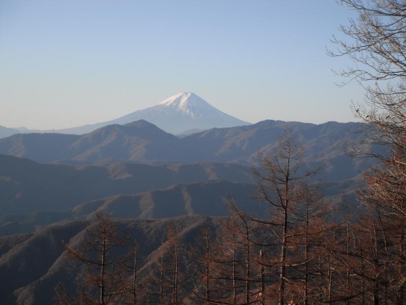 鷹ノ巣山手前の避難小屋で小休止。この縦走路の盟主、鷹ノ巣山へ向かいます。振り返れば富士山、そして南アルプス!初めての時はこんな景色を楽しむゆとりがなかったのですな。もったいないことをしたものです。鷹ノ巣山頂に着けば縦走路の難所は終わり!しばらくのんびりした後、ゆるゆると下っていきます。