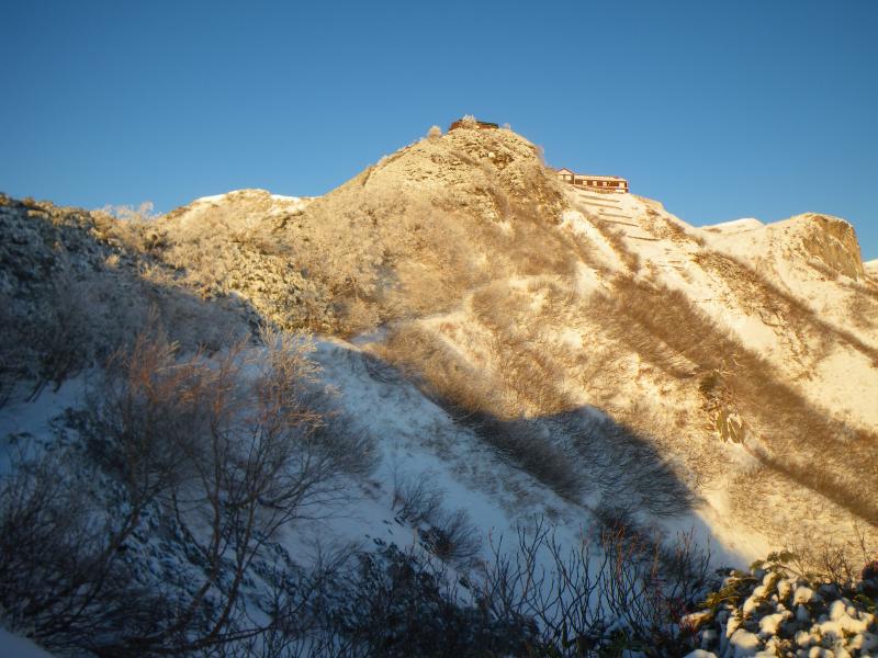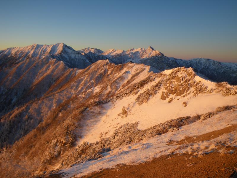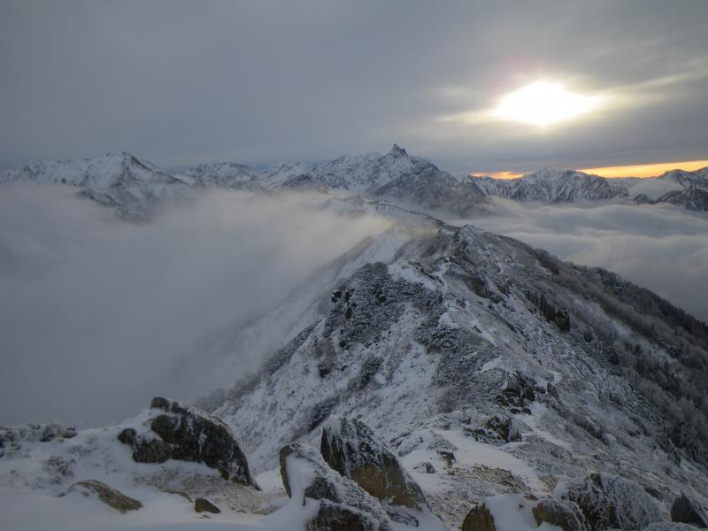 天気予報通リ、午後からガスが立ち込め、夜間は風雪になっていました。今回の冬型が弱いと見て、2日目は下山せずに停滞、すると15時頃からガスが晴れ、昨日と違い白く雪山らしい稜線と槍ヶ岳の背後に北アルプスの縦走路が見えました。このまま夕方まで夕日にやけるまで待って、画像を収めましたが停滞したのが功を奏しました。もちろん、小屋周辺は十分に雪が付いたので、水分の確保も心配なし。夜は寒気の影響で氷点下10度台で確かに冷え込みましたが夜空は輝く星空でした。