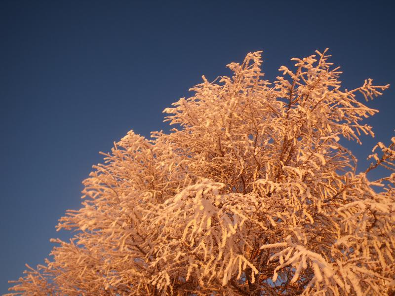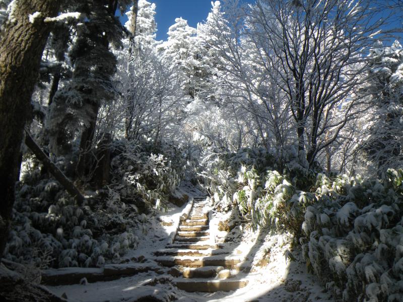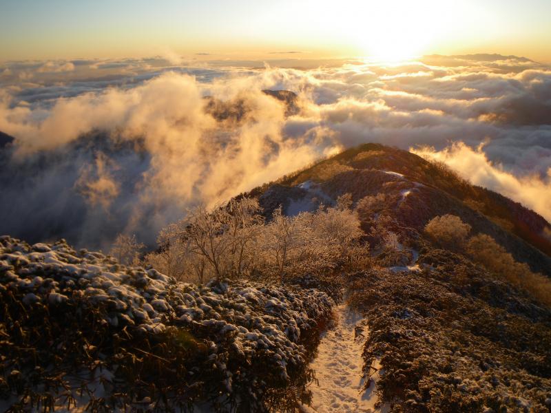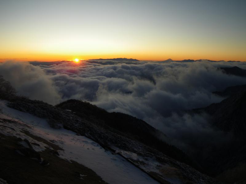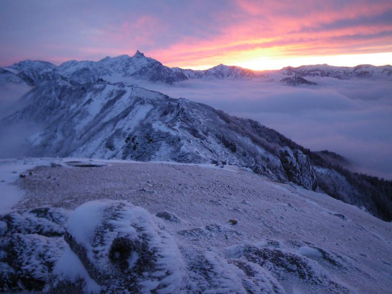 あくる朝は日の出を待って、日の出の画像を収めましたが、雲海に浮かぶ富士山は感動的でした。入山時とは違い、第二ベンチあたりまでは量は少ないですが、雪は積もっており、一面の樹氷は別世界でした。下部はこの樹氷から落ちた雪が積もっと感じでしたが、中房温泉周辺の山々は一面の樹氷状態で美しかったです。