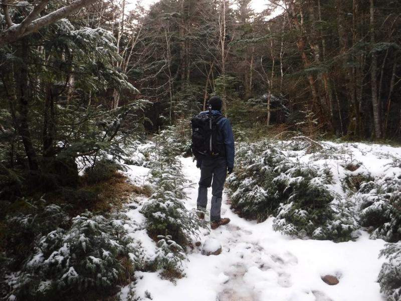 北沢南沢の分岐から2時間弱、行者小屋手前から雪。それまで雪はほぼなし。