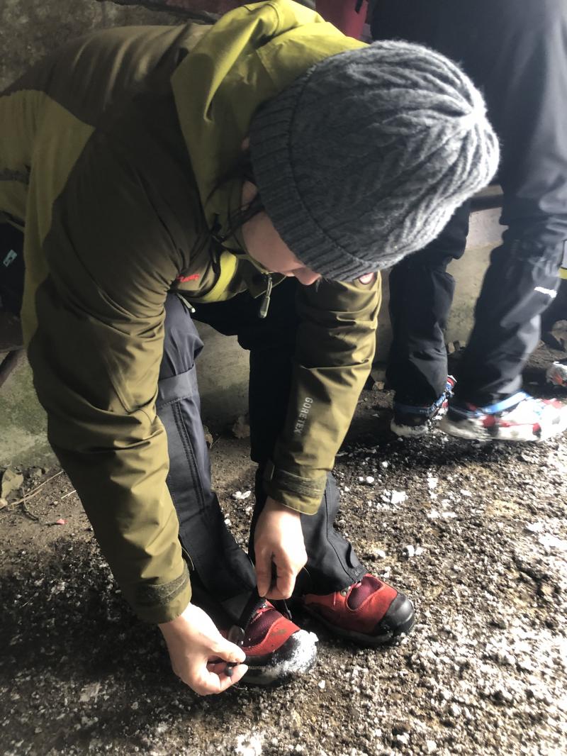 下山時はようやく軽アイゼンの出番です。初装着のお2人は事前に予習ばっちりでスムーズに準備完了。