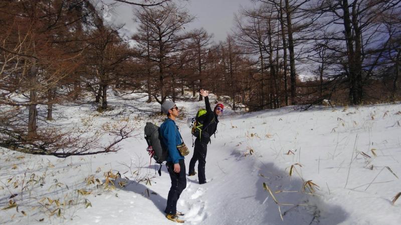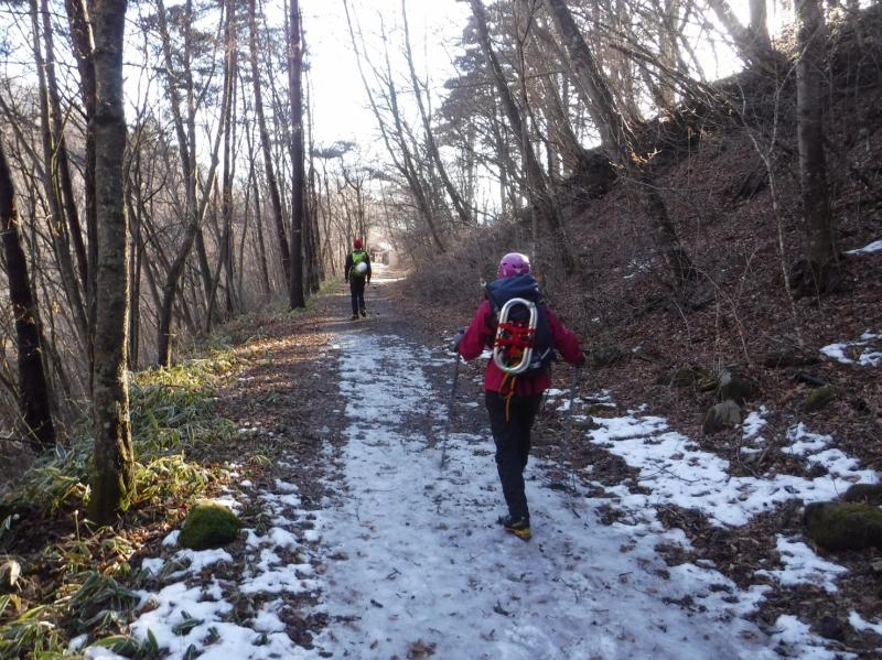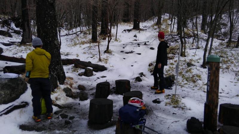 樹林帯後ルートわかりにくい、アイゼンに履き替えたもいいかも