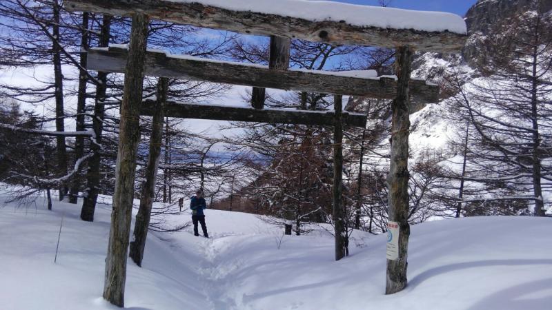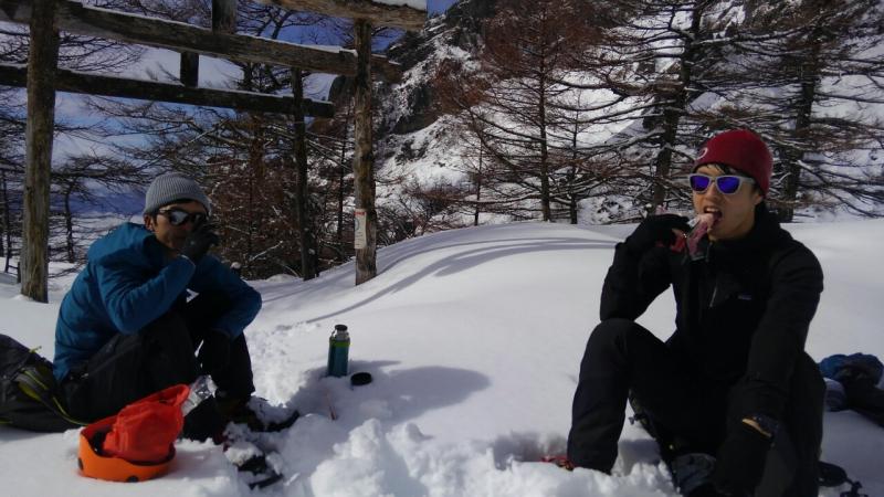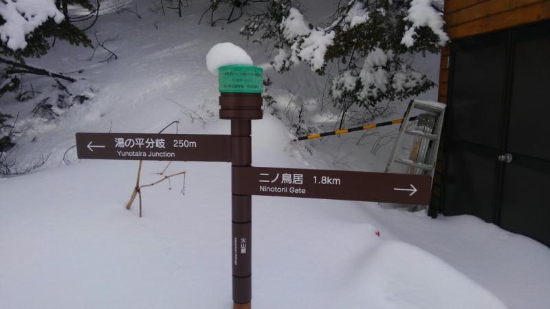 登山口から二ノ鳥居辺りまではツボ足で、途中雪深くなったところで2名わかん装着です。