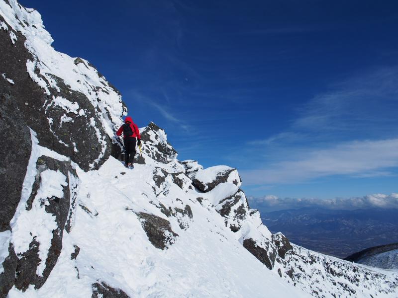 赤岳鉱泉で昼食にインドカレーを頂き、休憩後硫黄岳へアタック!稜線に出るまでのつづら折りの樹林帯が地味にきついです(寝不足と体調不良できつかったのかも・・・笑)。赤岩の頭付近になってくると横岳や赤岳が見えてきてテンション上がります!やっぱり晴れ、八ヶ岳ブルーは最高です♪ただ、赤岩の頭からは強い風が。やっぱりハードシェルとオーバーグローブ着用。寒いけど北アルプスや中央アルプス、南アルプス、浅間山、信越五岳などなどたくさんの山々が見えました♪山頂は誰もいなく貸し切り状態。硫黄岳から見る横岳、赤岳、阿弥陀岳は最高ですよね♪横岳西壁がかっこ良かった。山頂で絶景を堪能して赤岳鉱泉へ。