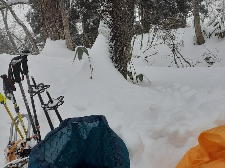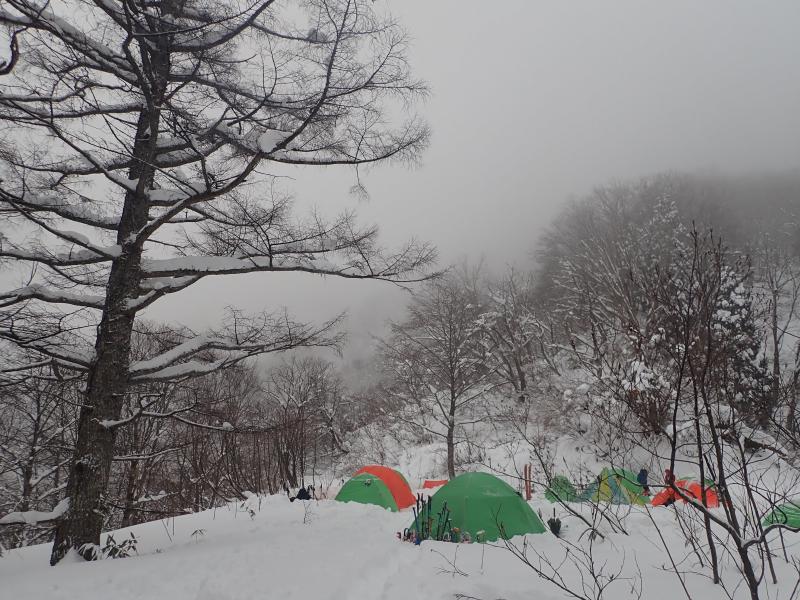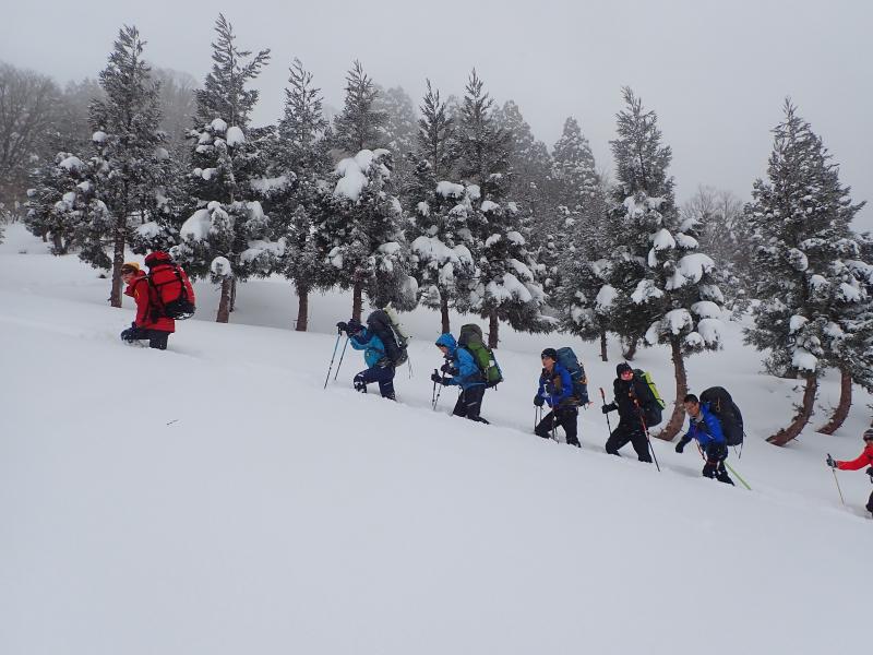 8・9日はあわすのスキー場上部でテントを張り、大品山目指して雪上歩行の基礎を勉強。
