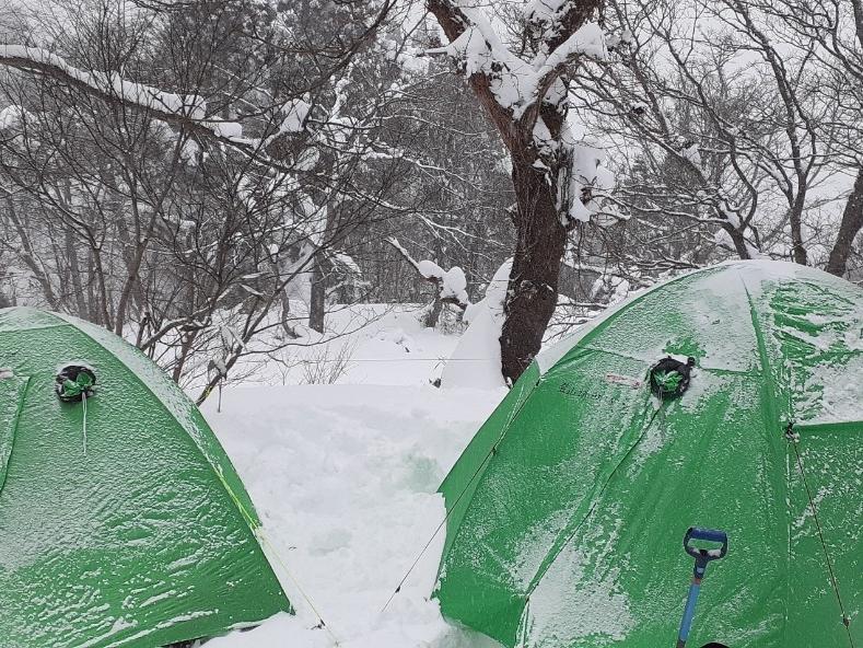 雪が降り続いており、テント設営・ギアの取り付け作業など用意の俊敏さの大事さも痛感。