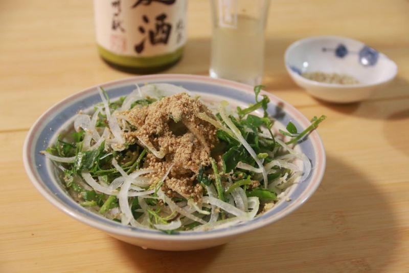 クレソンのサラダ クレソン、玉ねぎの薄切りを水分絞って、レモン汁、塩、ゴマ一杯、エクストラバージンオリーブ湯で絡めるだけ 酒の肴にぴったりです。