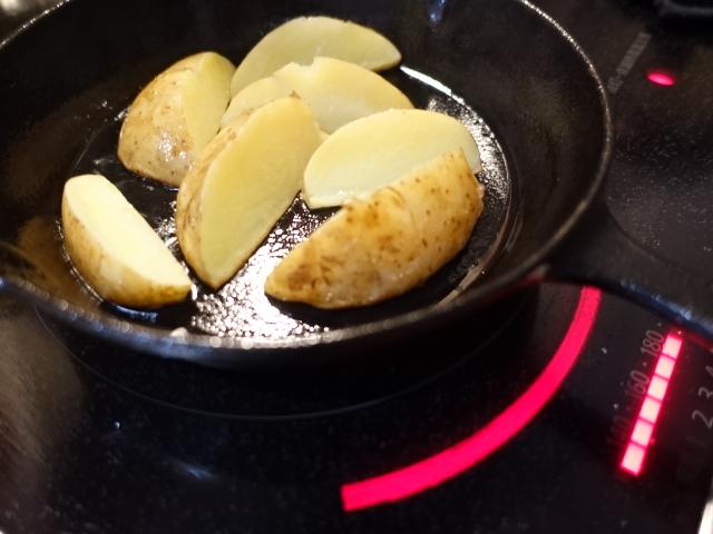 じゃがいも2個(8等分にして使いました) オリーブオイル大さじ2杯 塩黒コショウ マヨネーズ/ケチャップ/粒マスタードはお好みで スキレット