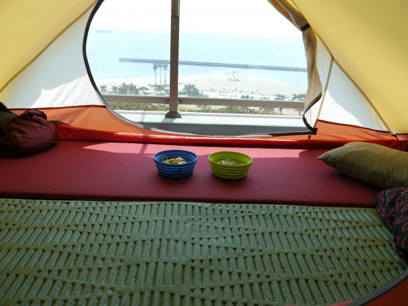 ・ベランダではテントが風で飛ばないように注意、物干し台に固定しました。
