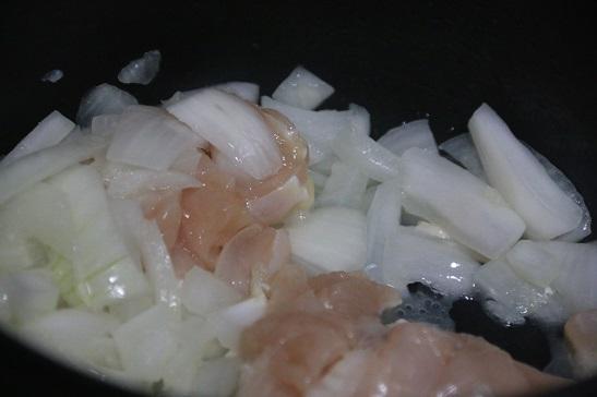 玉ねぎと鶏肉をオリーブオイルで炒めて蛸、アサリを加えて白ワイン加え火を飛ばします。