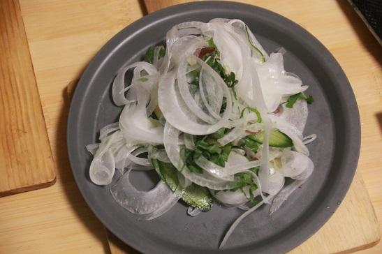 食材 明石蛸、鶏肉、玉ねぎ、アサリ、薄い豆 パプリカは使いませんでした。