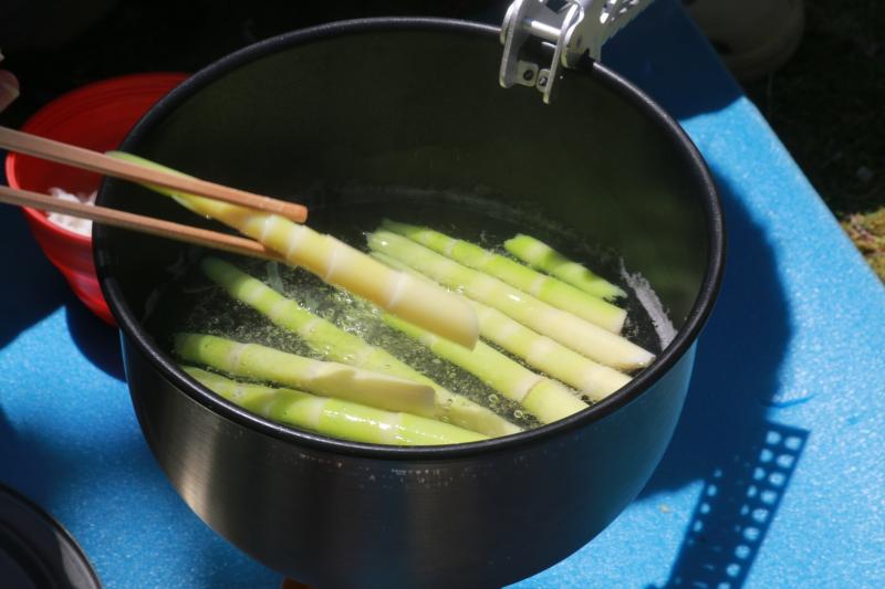 ネマガリタケは皮をむいて、茹でます。少し切り目を入れていると非常にむきやすかったです。
