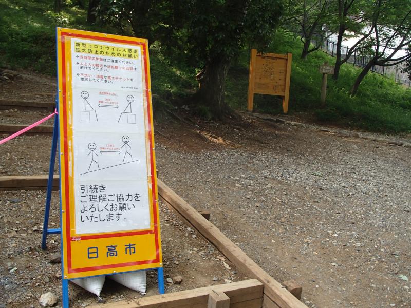 ・二の鳥居には3名の方が眼下に広がる巾着田の展望を見ながら談笑されていました。マスクを着けてソーシャルディスタンスも守って(ワタクシはBUFFでした)。さぁ、あと少しで山頂です。