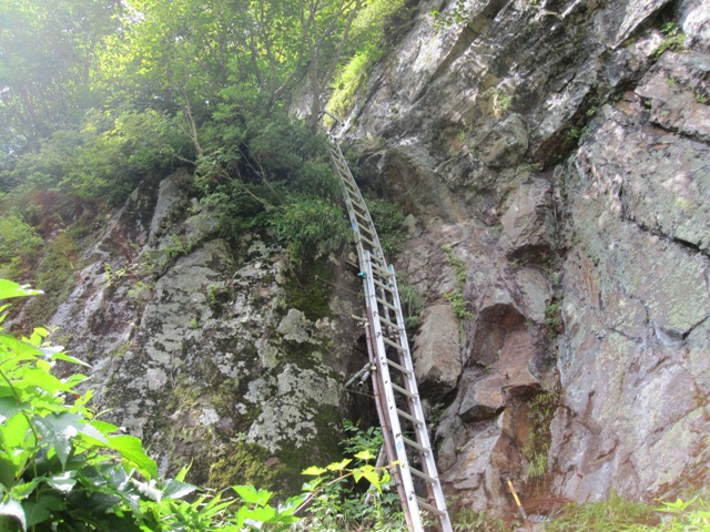 小屋までの道のりでは途中何度かハシゴが出てきます。濡れていると滑りやすいので気をつけてください。展望台を下り、頂上までは一気にガレ場を登っていきます。
