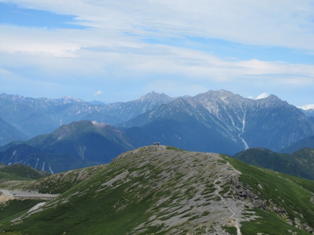 3000mの高峰が並ぶ北アルプスの中で標高は一歩引けを取りますが、晴れた日には目線の高さで穂高連峰を望めるようです。残念ながら私が頂上に着いた時はガスが充満しており、穂高連峰を一望することが出来ませんでした。