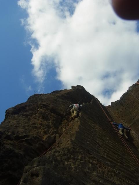 グローブを着けた手でホールドを掴み、アイゼンの前爪でしっかりスタンスにのろうとしますが……「ホールドがつかめない!」「スタンスにのれない!」の連続でヒヤヒヤしました(笑)