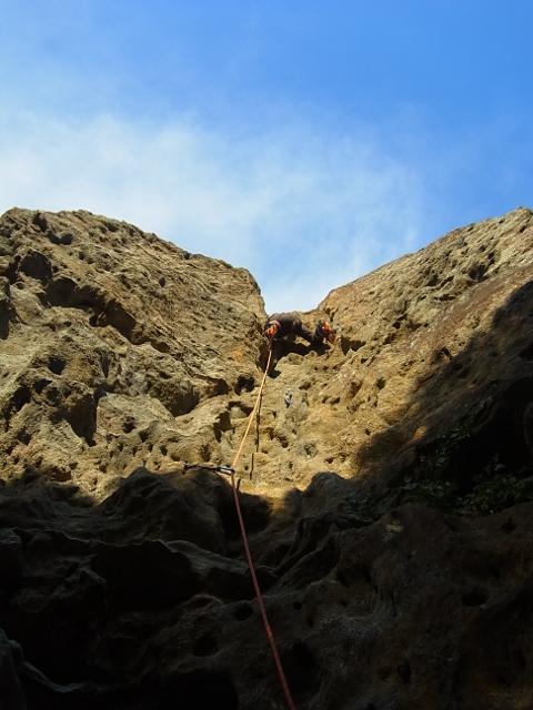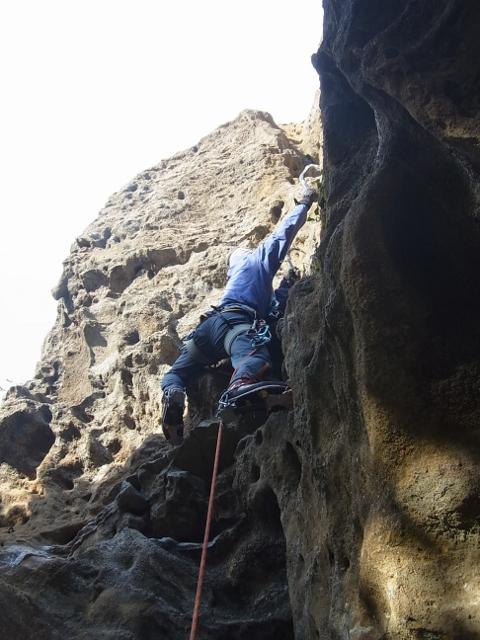 冬のバリエーションルートを想定し、足にはアイゼン、手にはグローブを着け、普段クライミングシューズで登っているルートを登ります。