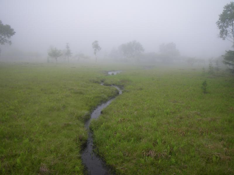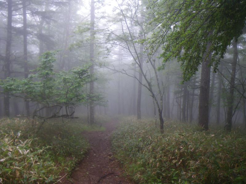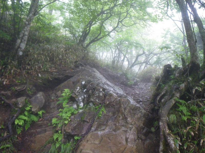 そんな山頂には用がないので早々と大阿原湿原へ進みます。こちら方面には人があまり行かず、雫に濡れた新緑がきれいな登山道ですが、地図にないような脇道がたくさんあり、注意が必要です。