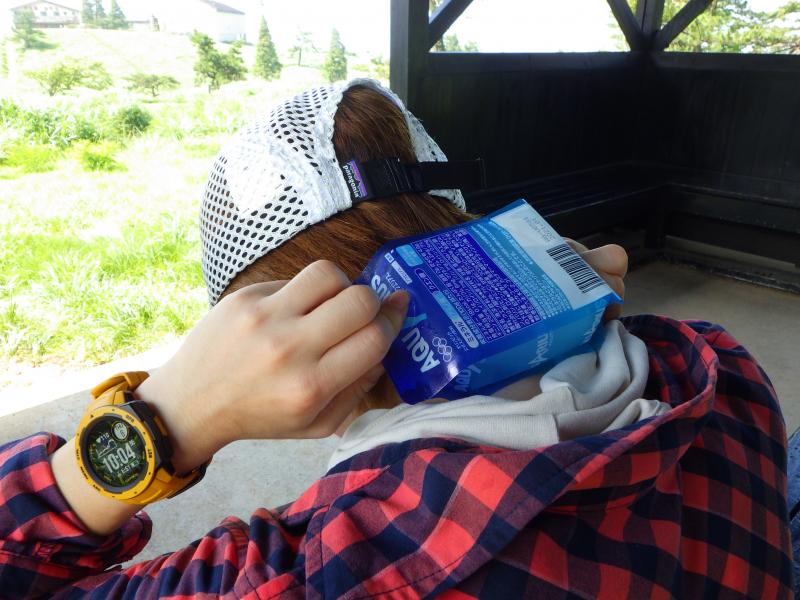 凍らせたドリンクを3つまとめて持っていきました。休憩時に、頭や頸椎を冷やし、