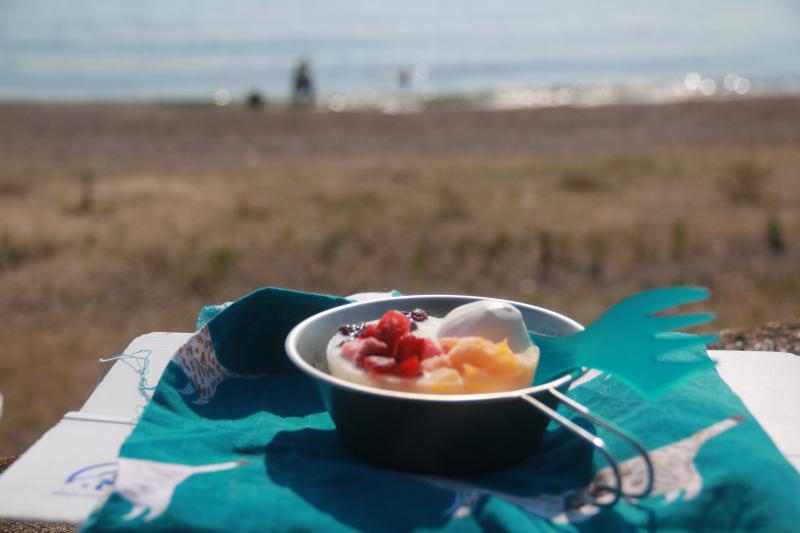 氷をいれたリバースカップとアイスを保冷剤を入れた保冷ボックスに入れて海でまったり過ごしました。カップ変えると、気分も変わります。テントのフライをタープ替わりにすると涼めます。