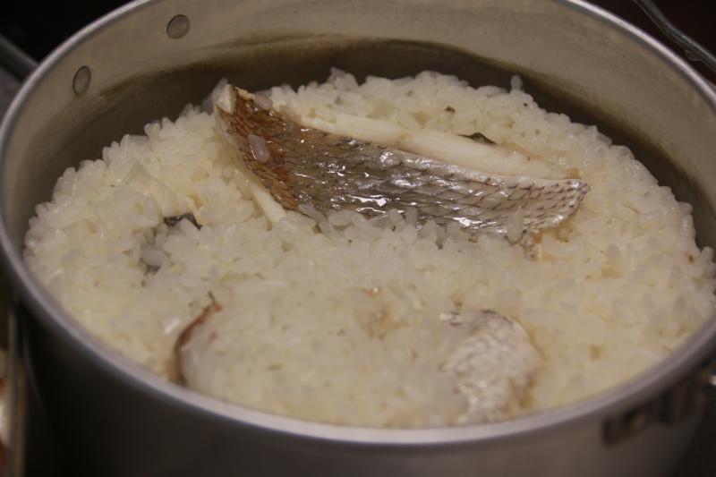 「鯛めし」 鯛の切り身、酒、塩(天然塩)と昆布を入れ