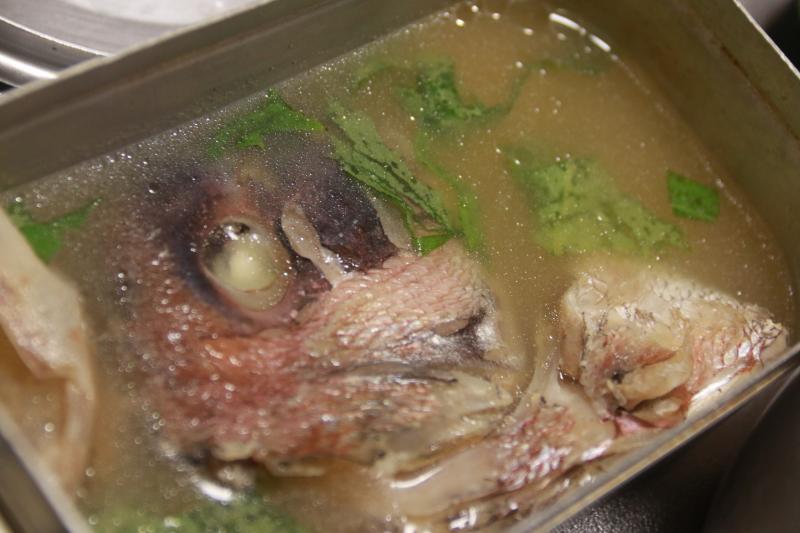 臭みを抜いた、鯛のアラと 昆布、塩、水で炊き 沸騰直前に昆布を抜いて、お酒を加えて少し煮立てます。 コンソメの出汁くらい旨い出汁がでます。最後に少しだけ醤油(うまいやつ)を加え 好みで紫蘇をくわえて完成です。こちらはメステインで作りました。