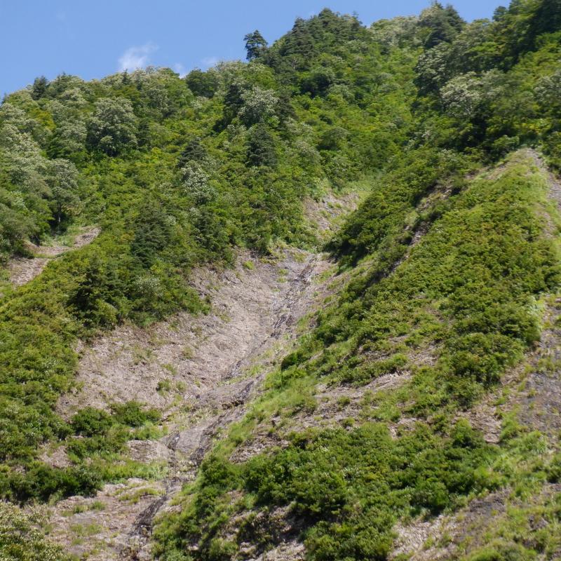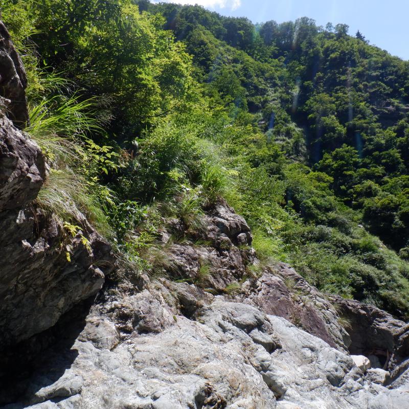 高巻きは岩壁上部から灌木帯のトラバースへ。