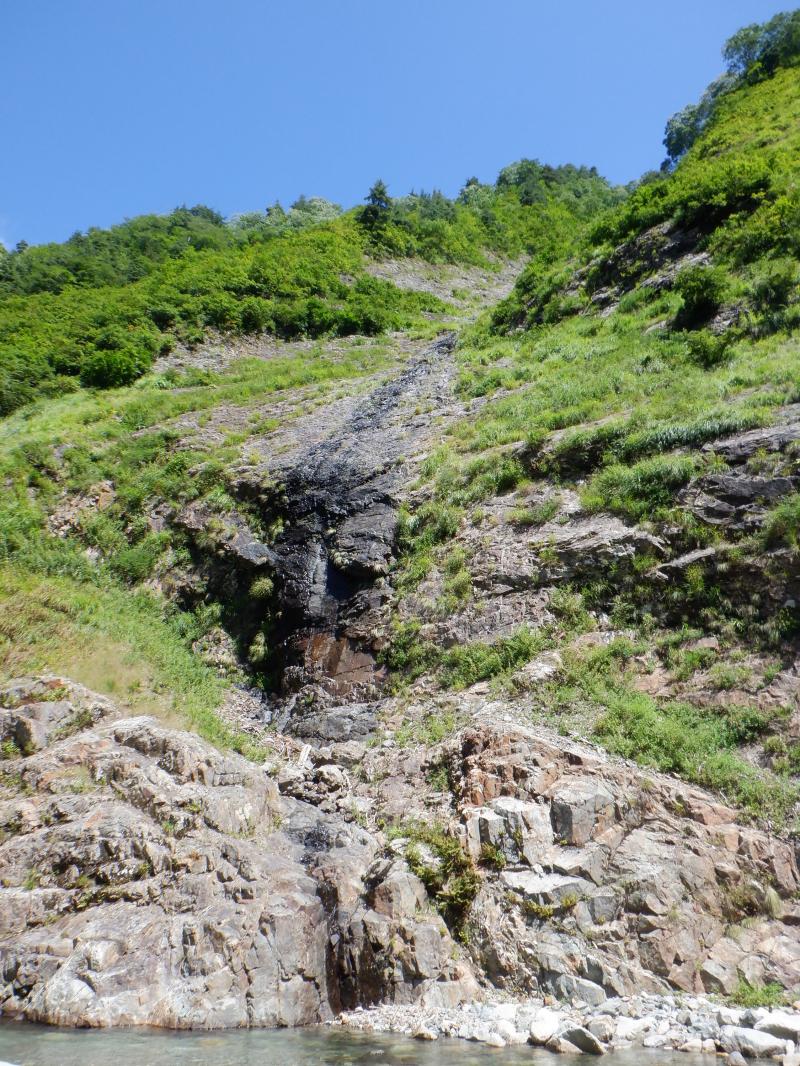 さて御神楽沢出合の対岸に、何やら不思議な滝が見えてきました。