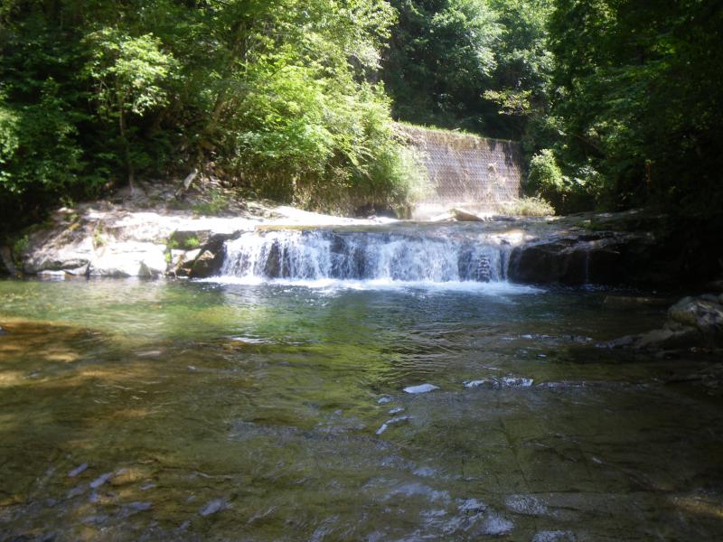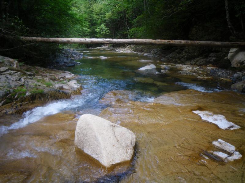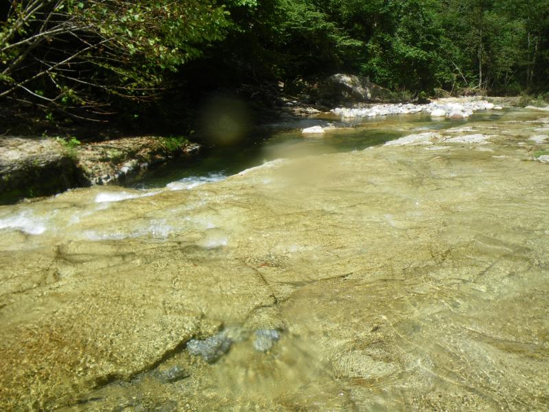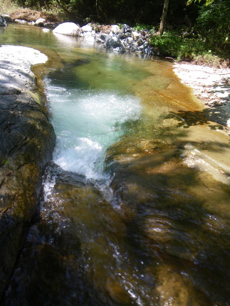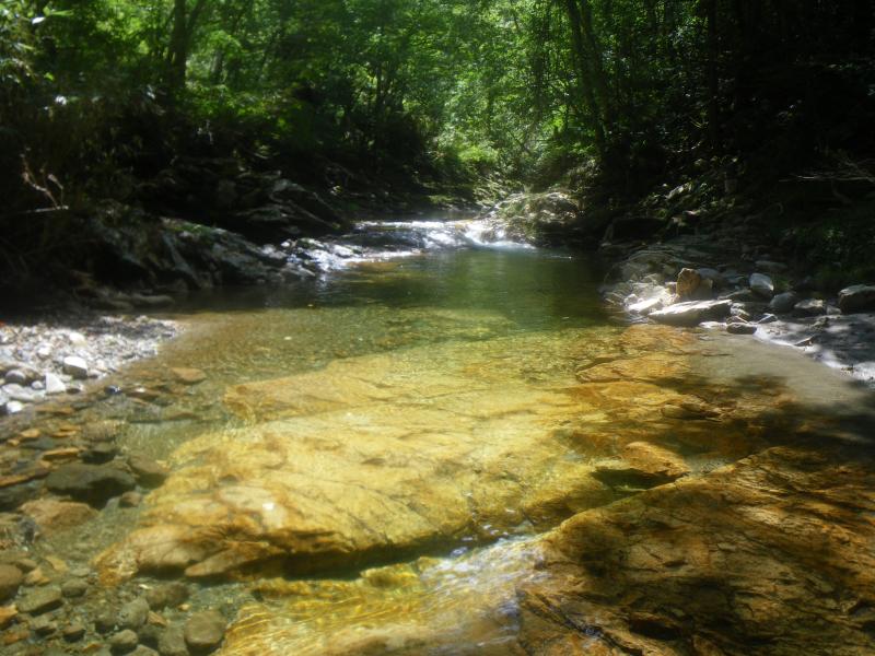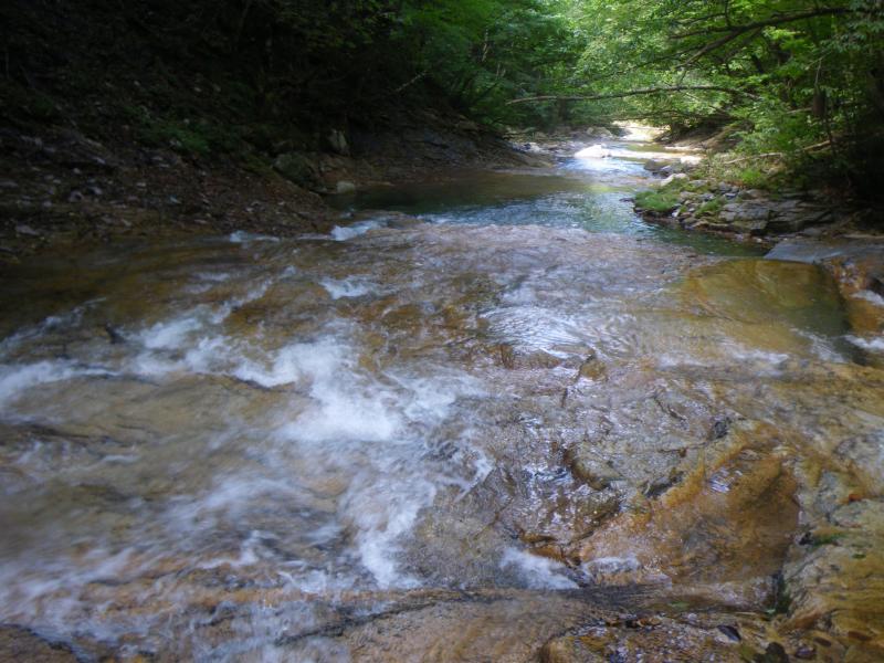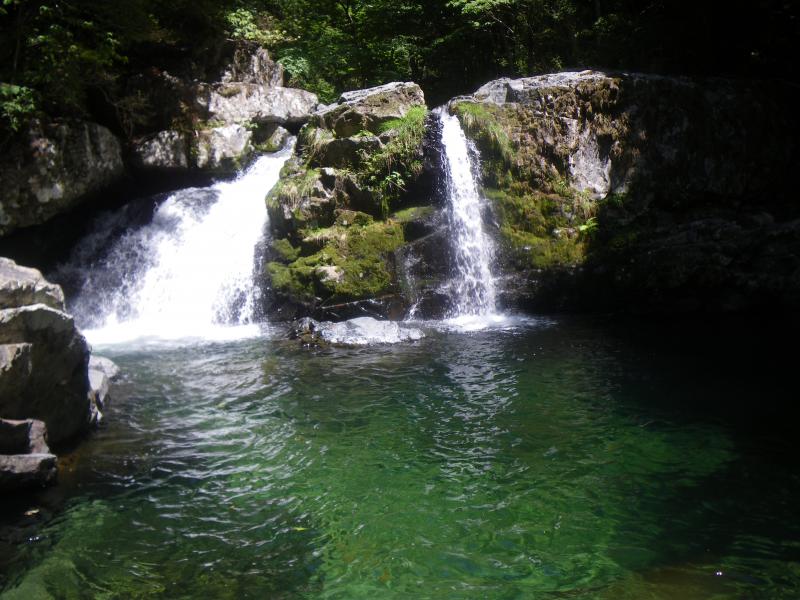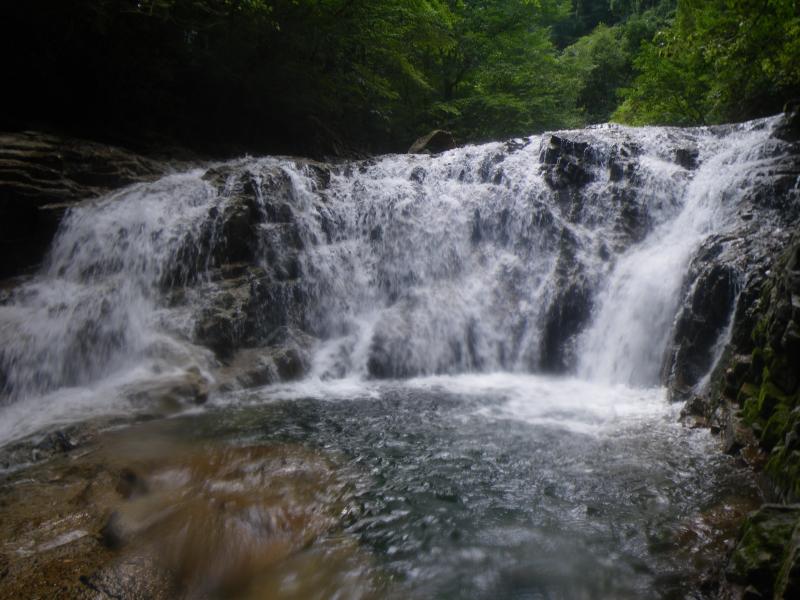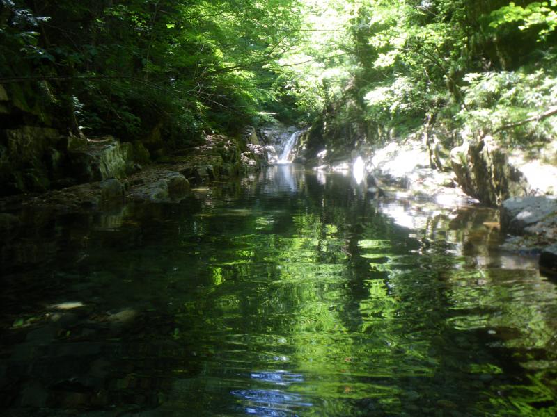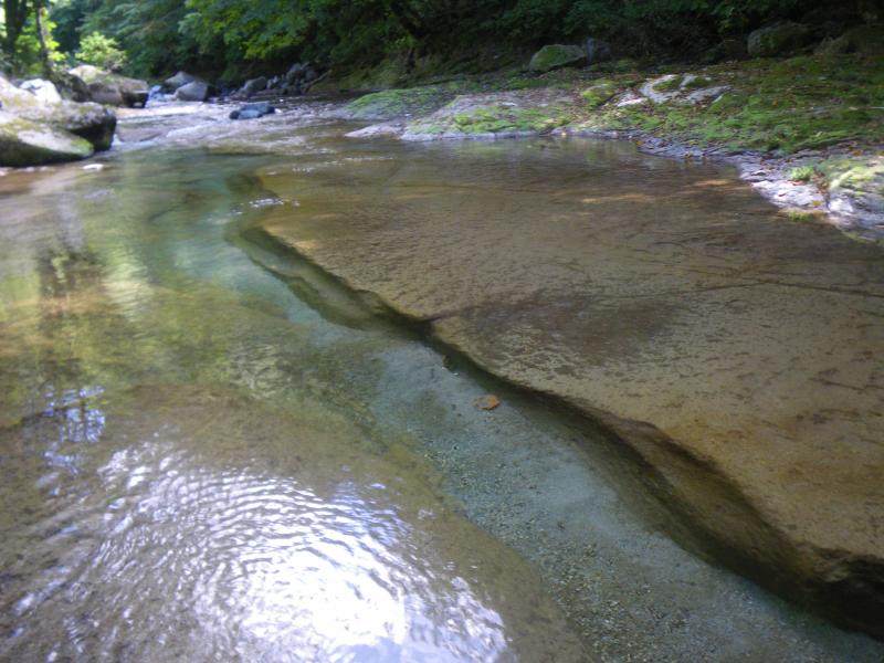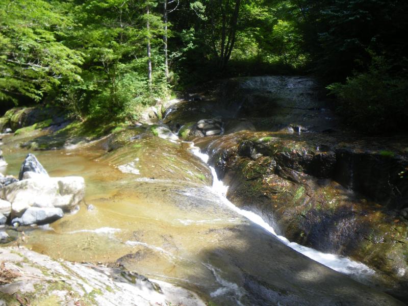 ここは沢沿いに林道が走る為、好きな箇所から入れますが、いっぱい楽しむ為に木地屋大橋から林道に入って、すぐの支流の端から入渓。もういきなりナメ床が延々と続きますが、適度に穴があいていて、そこで浸かって体を冷やします。ナメ床ばかりではありません、登れる幅広のナメ滝、終盤に出てくる長淵もあり、泳げる箇所もありますが難しい箇所はなく、好きなスタイルで歩けました。猛暑とはいえ、泳いだりするとさすがに冷たいです。右手から支流が入り、左手に小屋が見えた箇所で終了。