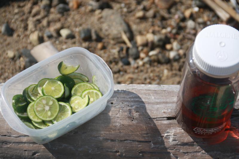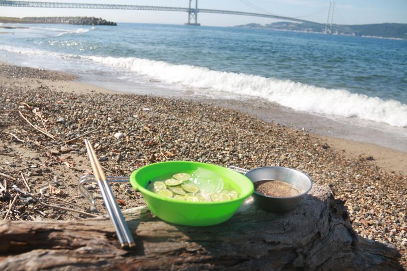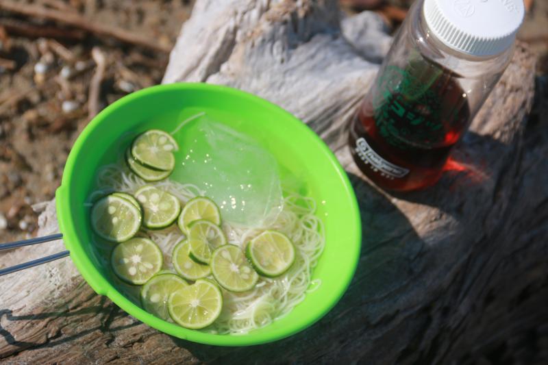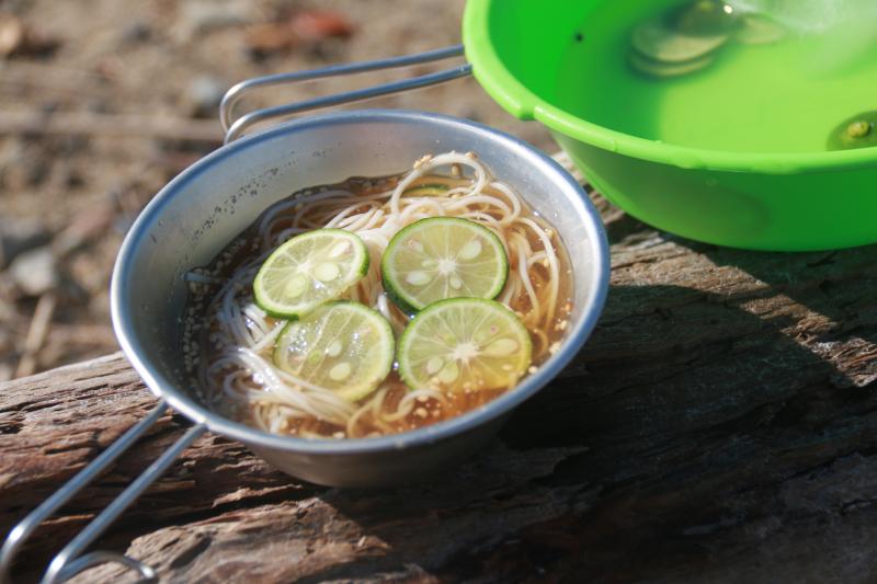 outidoor 四国土産の朝海ご飯 冷やしスダチ素麺とアイスコーヒー