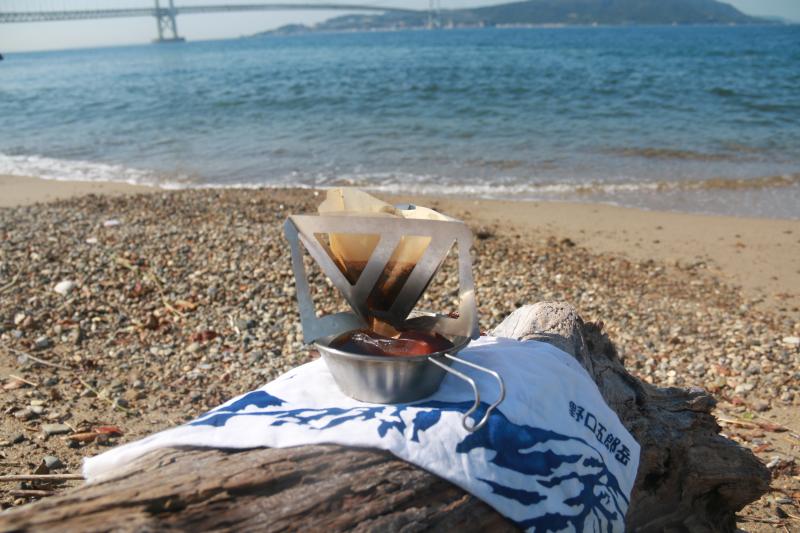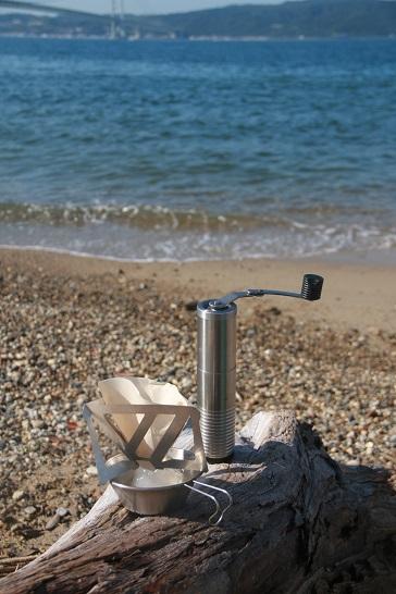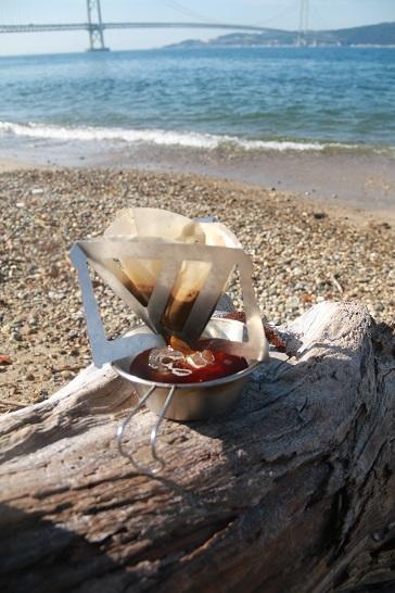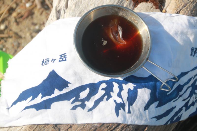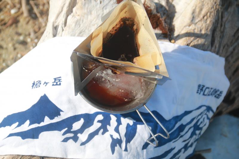 食後に「フクダトミオブラジルブルボン」の珈琲豆を少し細かく挽き 、シェラカップに氷を入れ